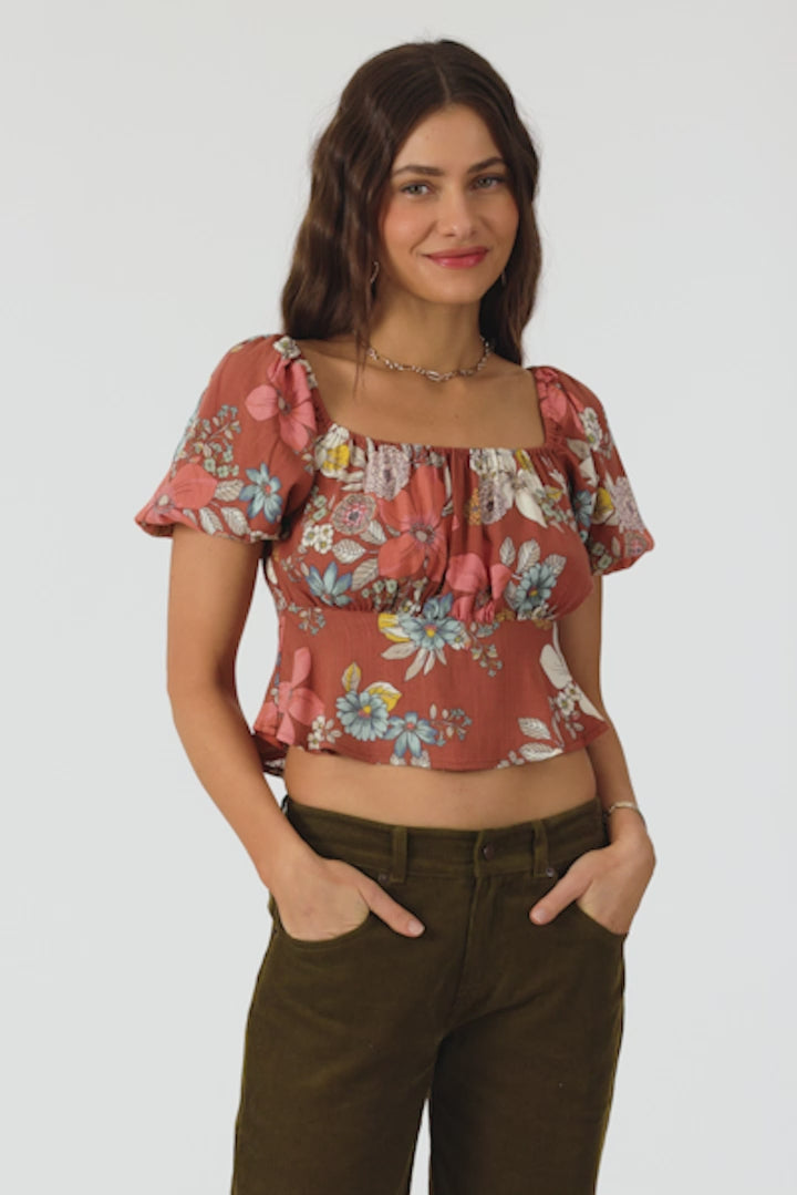 Ready for sunshine woven short sleeve top that has a colorful print design, lightweight fabric feel and puff sleeve detail.