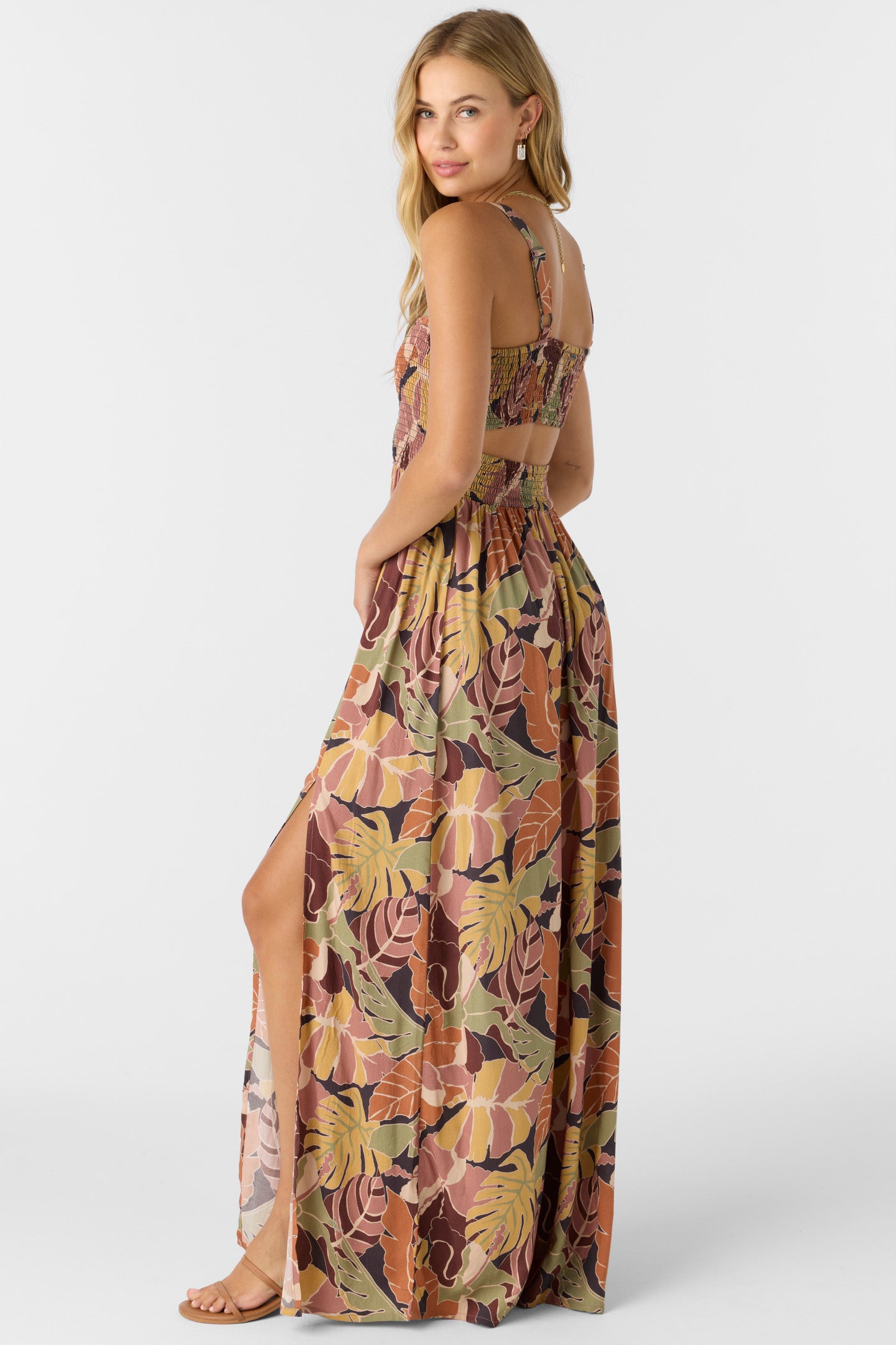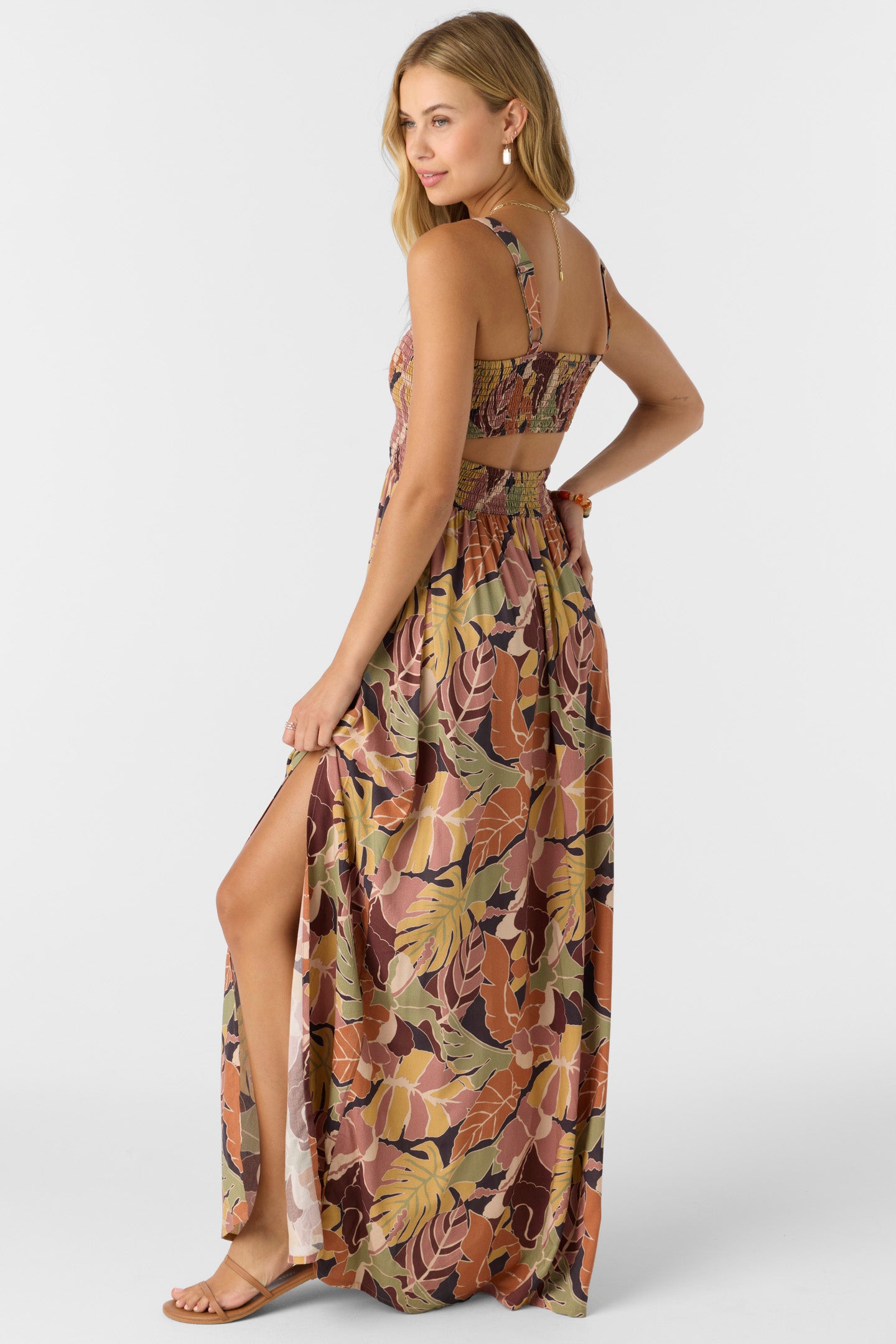 You'll love this sweet and flowy maxi dress. It has an allover print design and back cutout detail.
