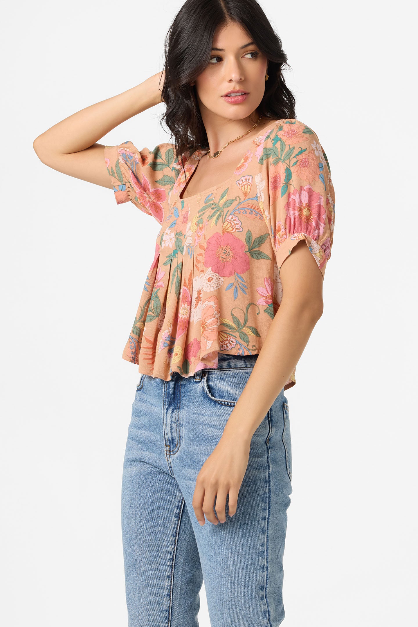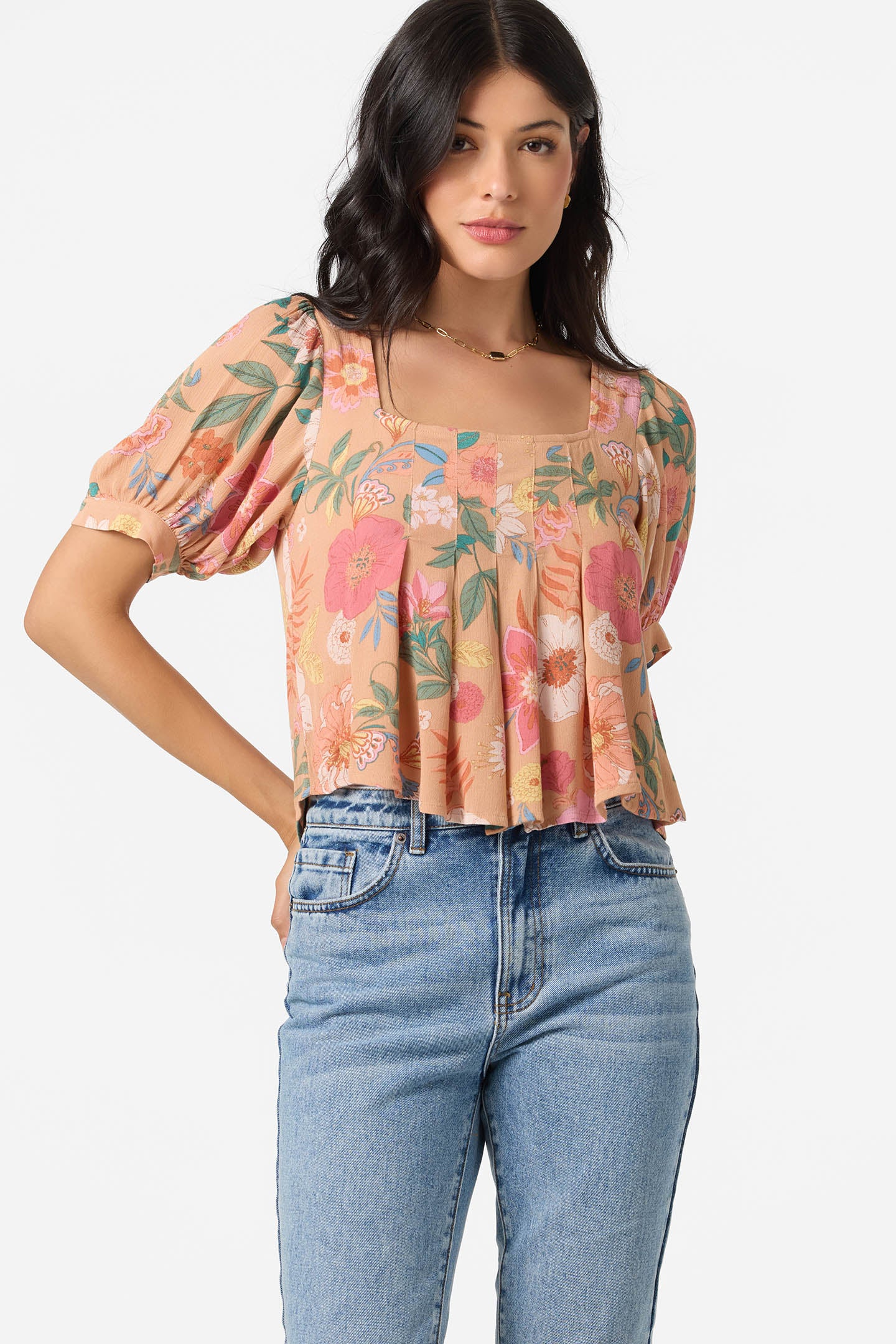 Airy and effortlessly sunlit, this woven puff-sleeve top features delicate pleats, a breezy back tie, and a playful coastal print, made for days that drift with the tides.