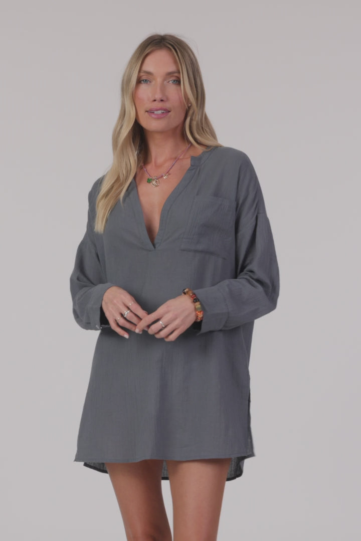 A flowy cover-up to elevate your beach look. It has a long sleeve design, saddle cut hem and v-neckline.
