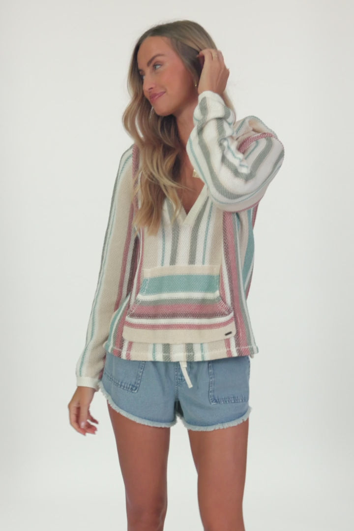 A sweater weather essential featuring a stripe knit design, relaxed fit and hood with v-neckline.