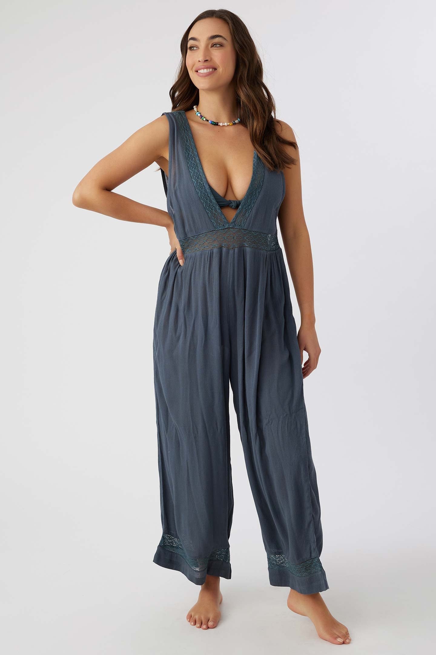 A relaxed cover-up jumper that has a woven tank design, inset crochet detail and deep v-neckline.