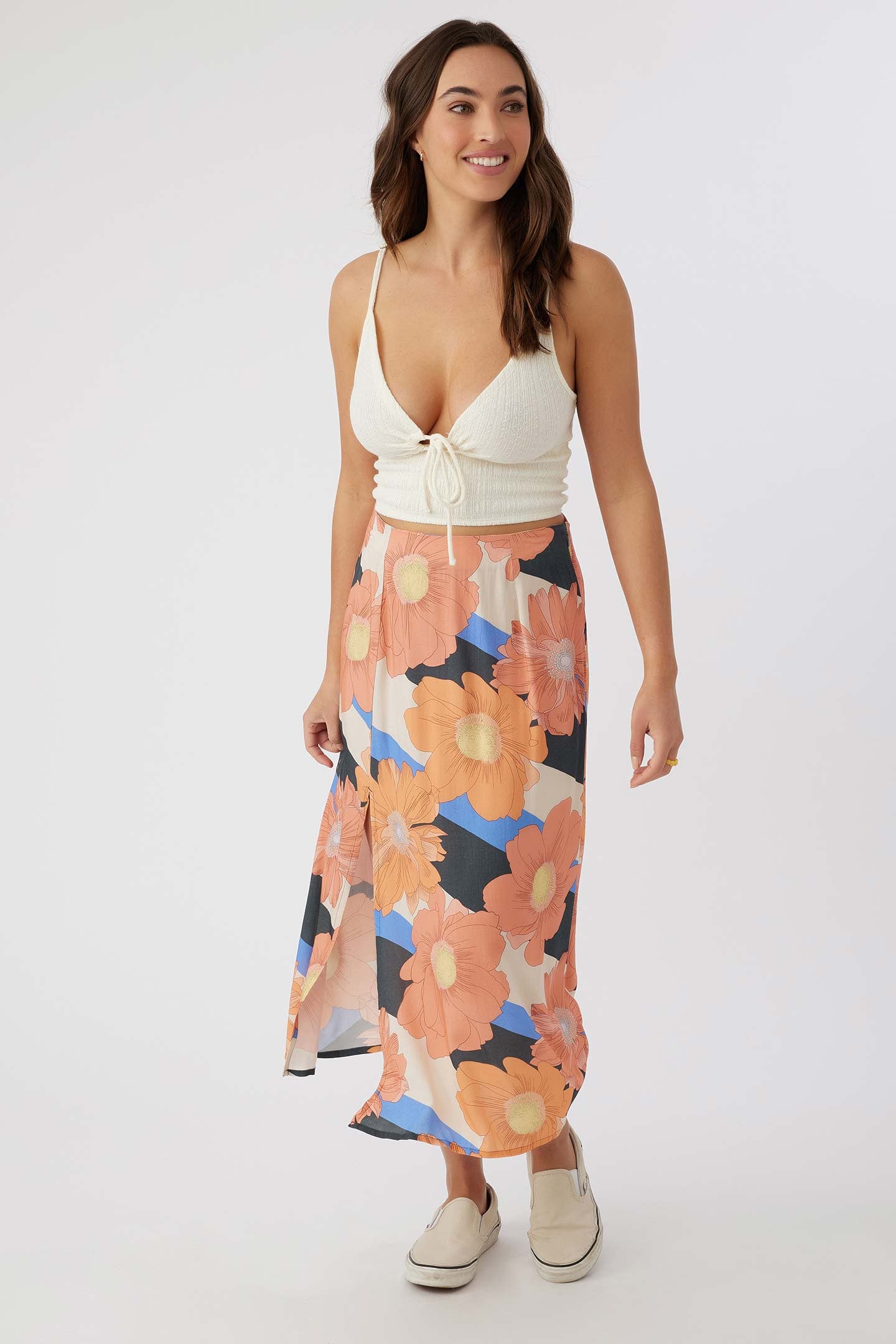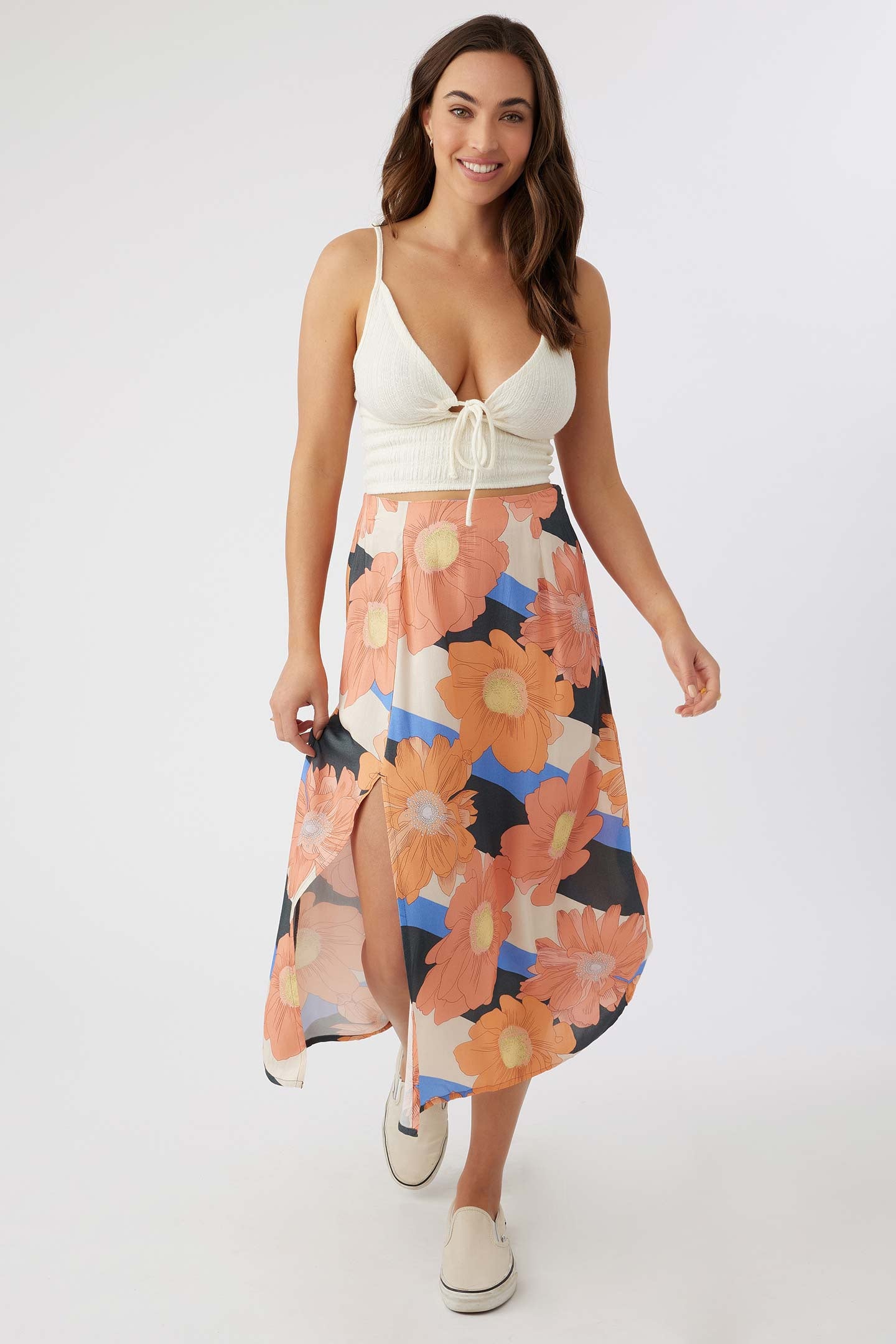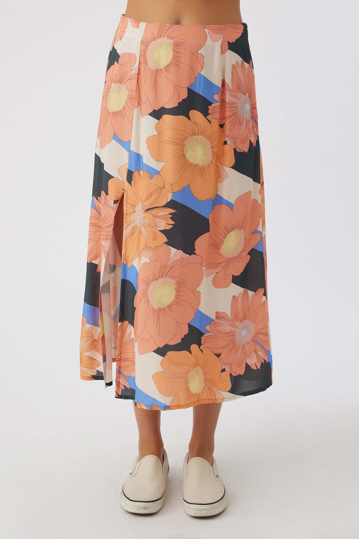 A flowy woven skirt that's perfect for any season. It features a colorful floral print and side slit detail.