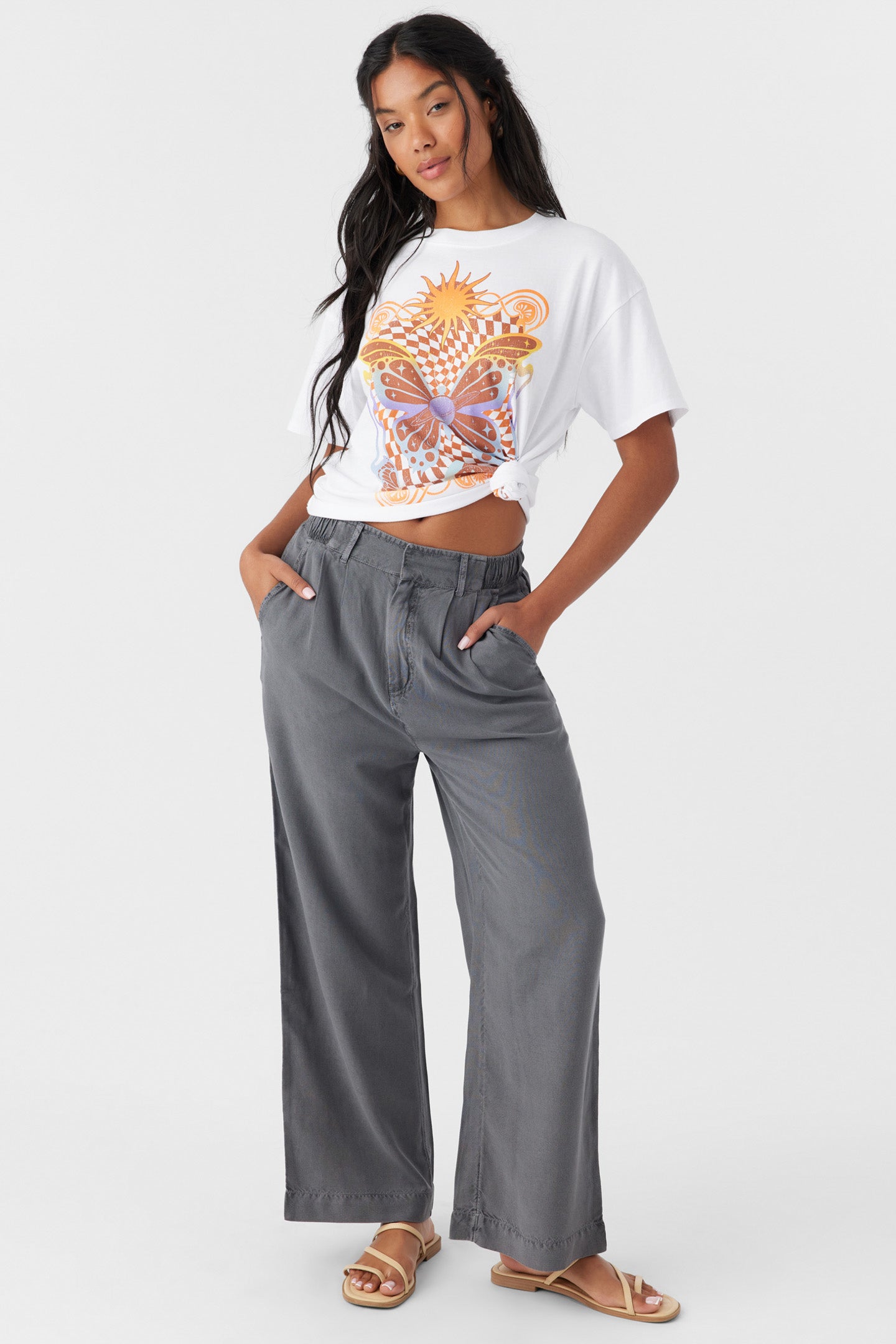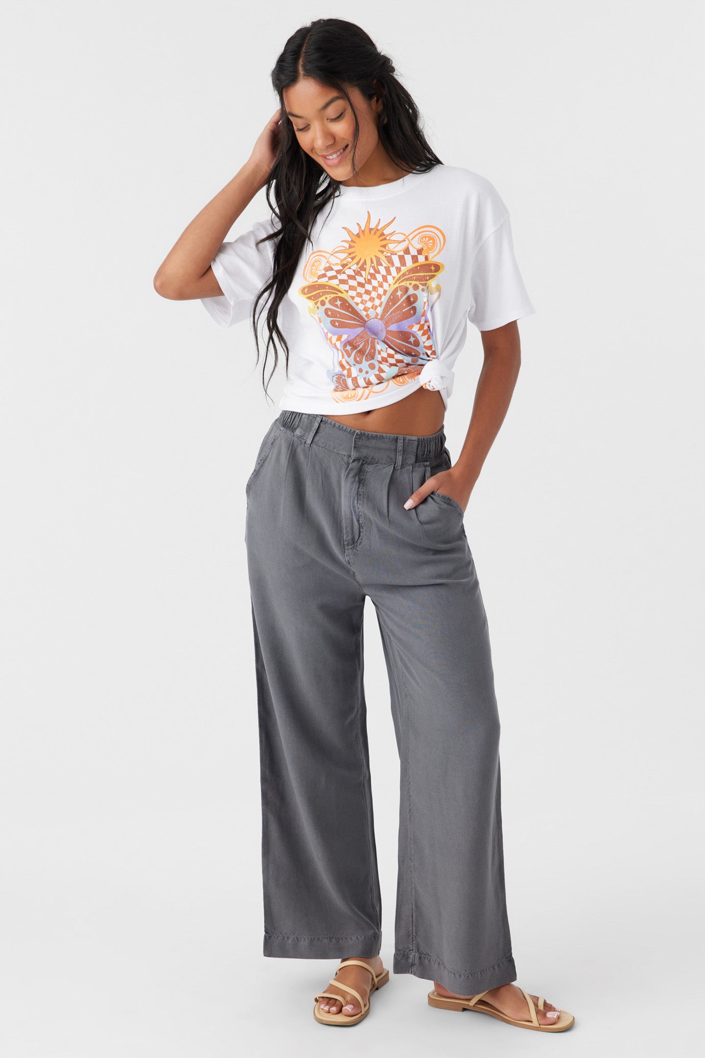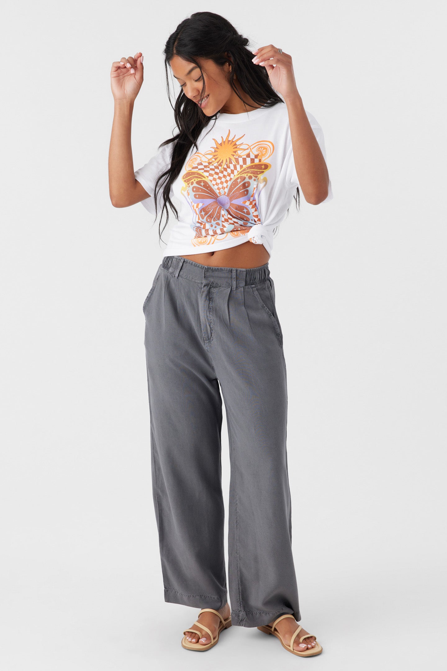 Cute and casual lightweight woven pant that has a comfort elastic waist and solid color wash.