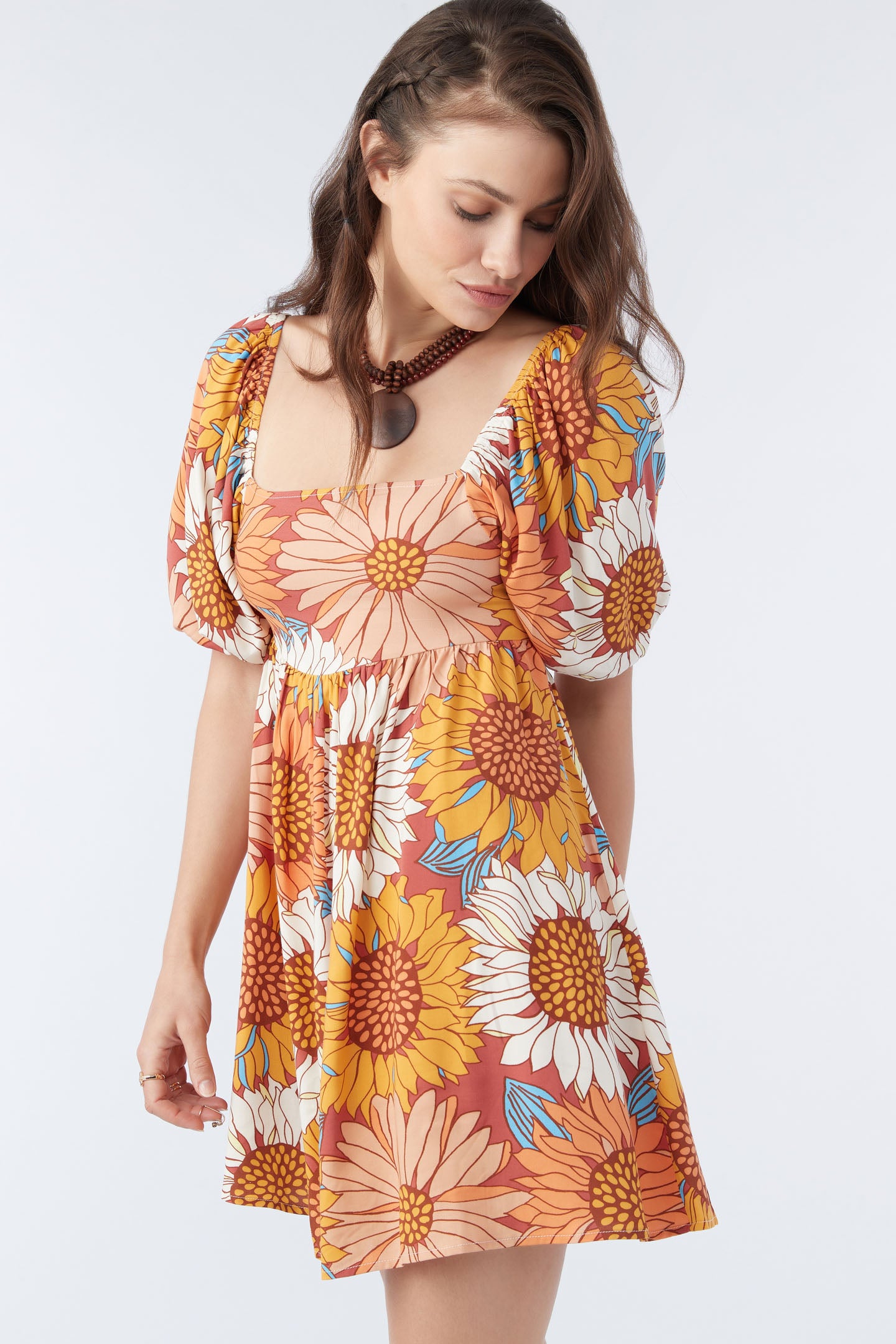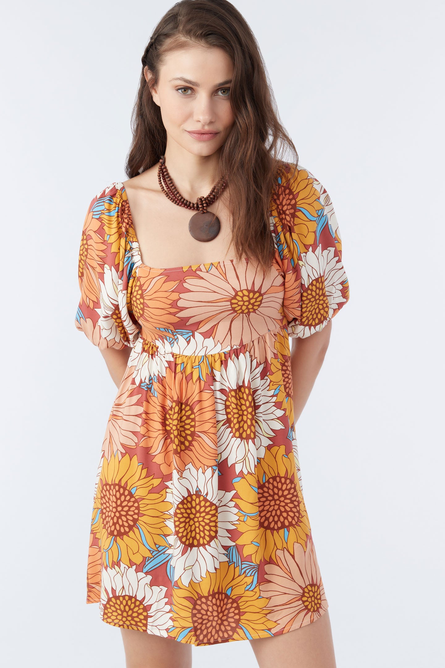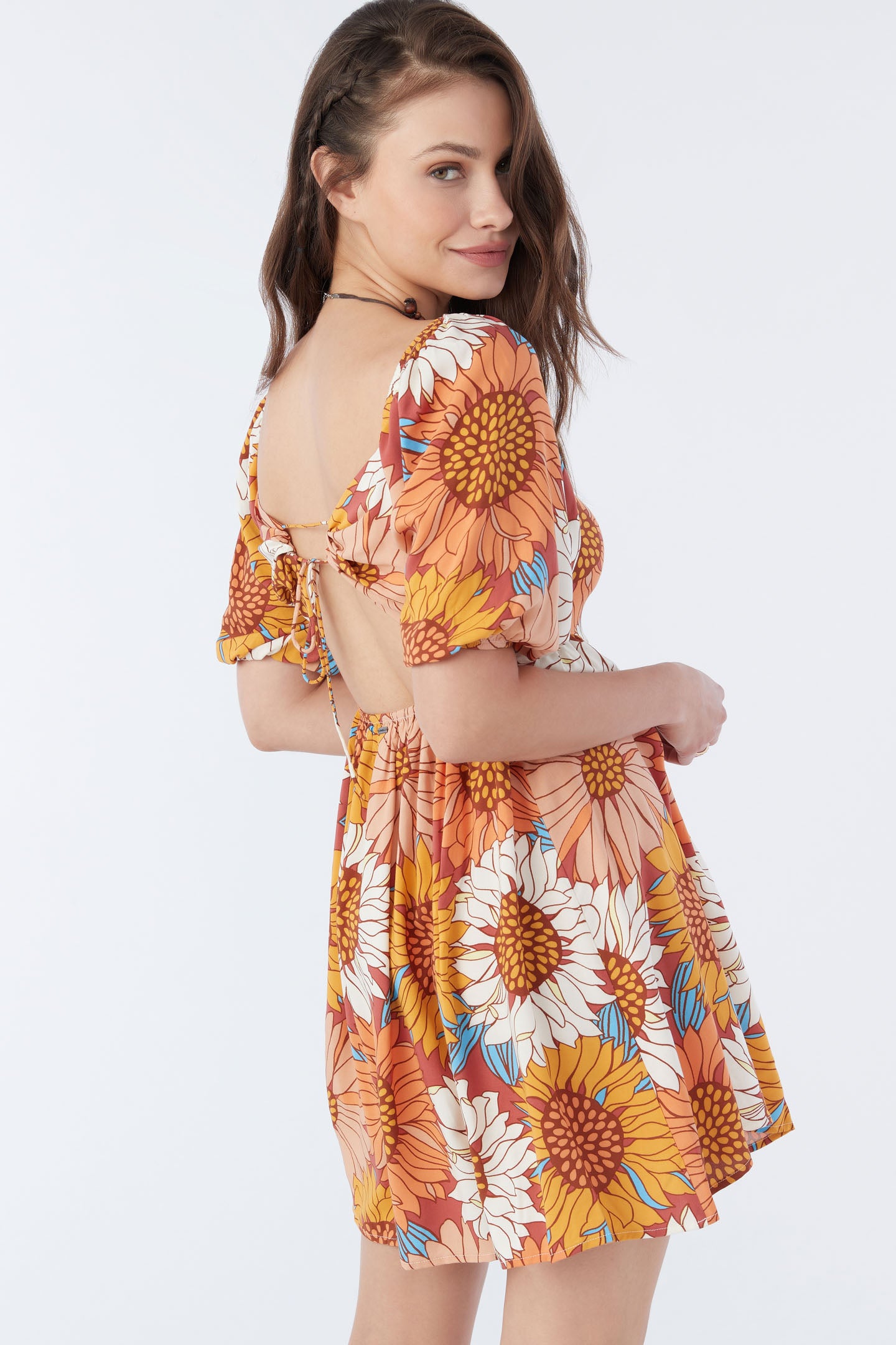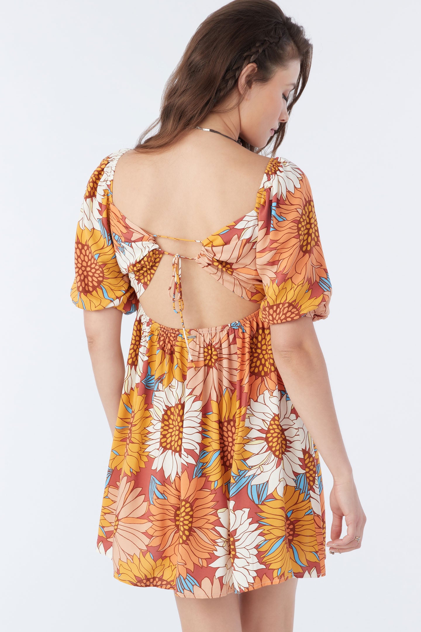 Ready for anything woven mini that has a colorful print design, elastic puff sleeve detail and cutout at the back waist.