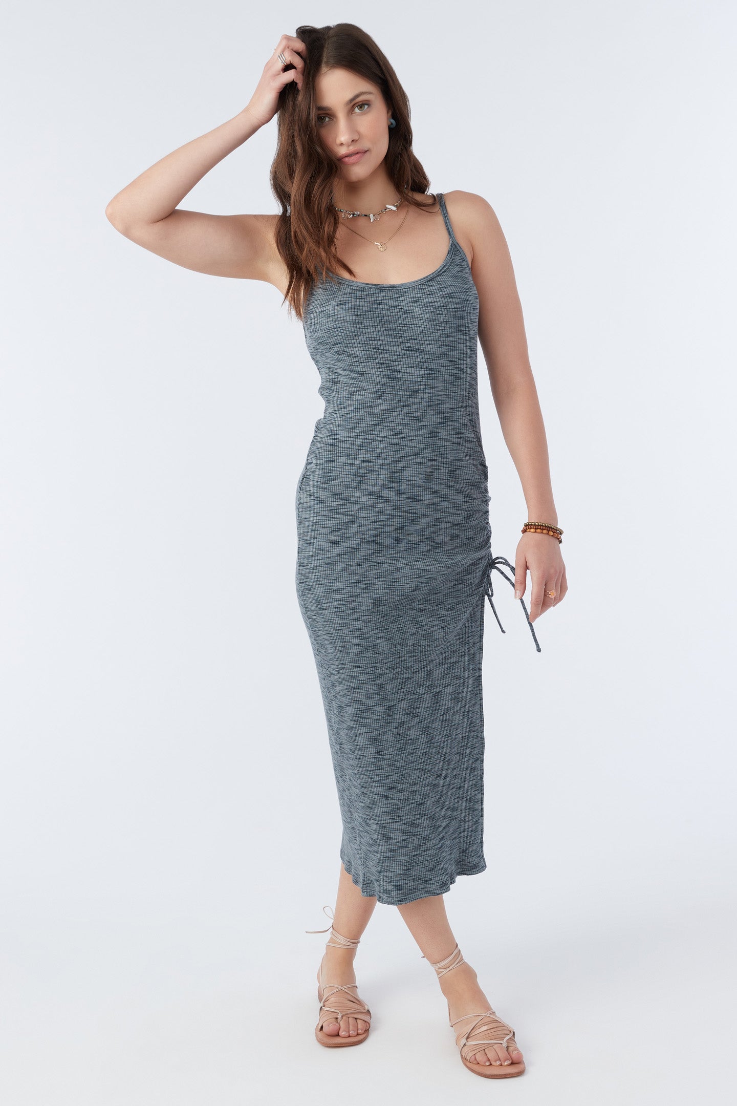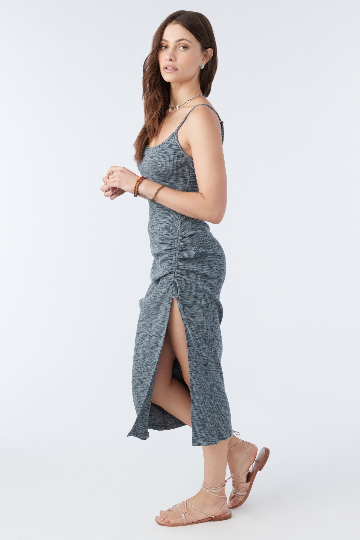 Dress into sunny days. This knit midi has a front slit design, cinch tunnel detail and soft feel.