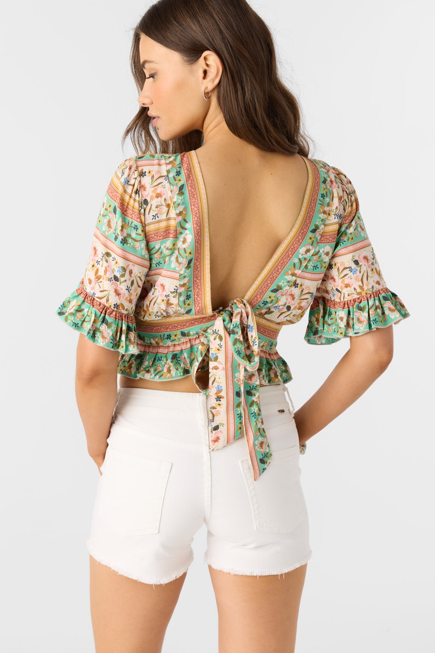 So sweet woven top that has a breezy, relaxed fit and deep v-neckline with self-tie.