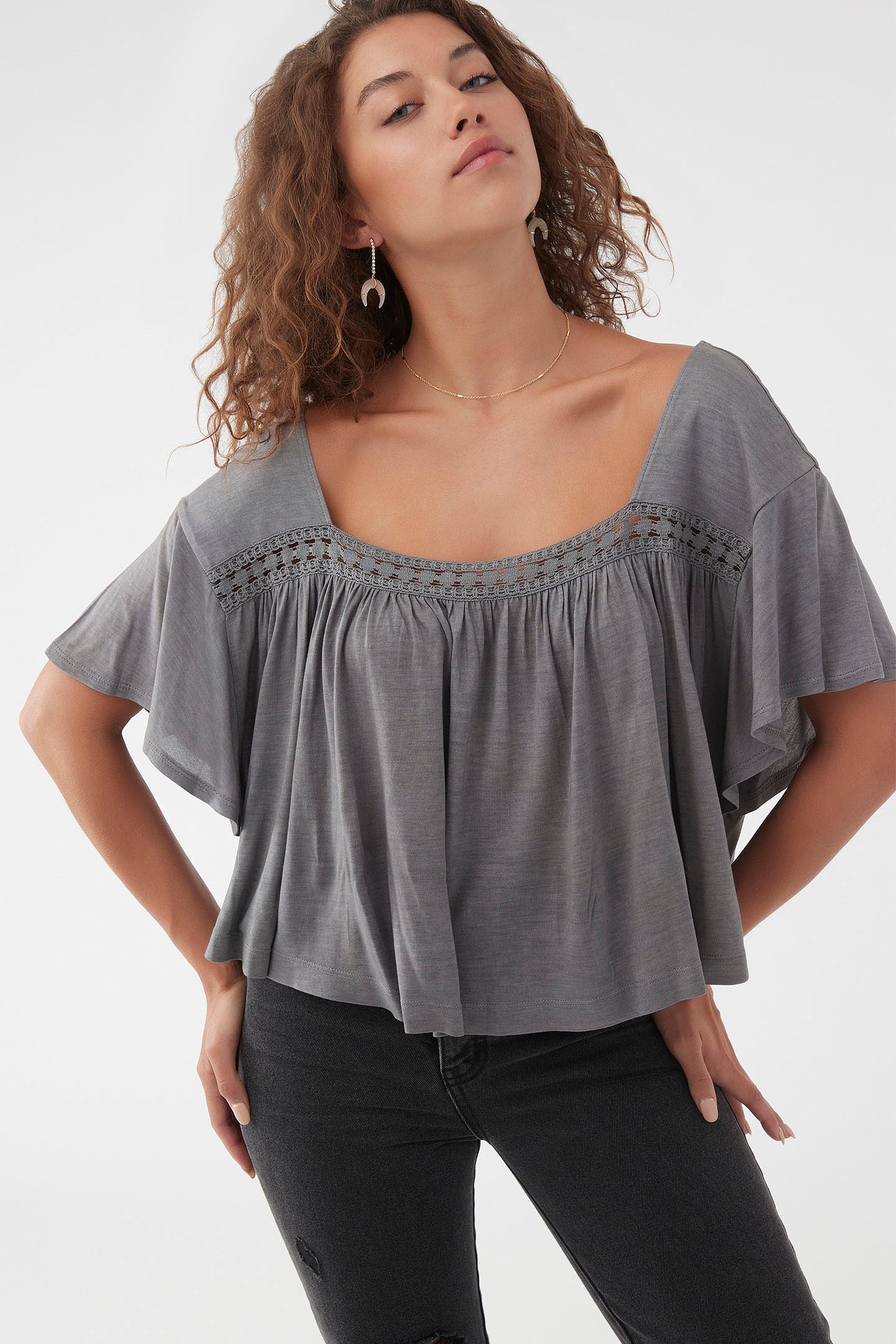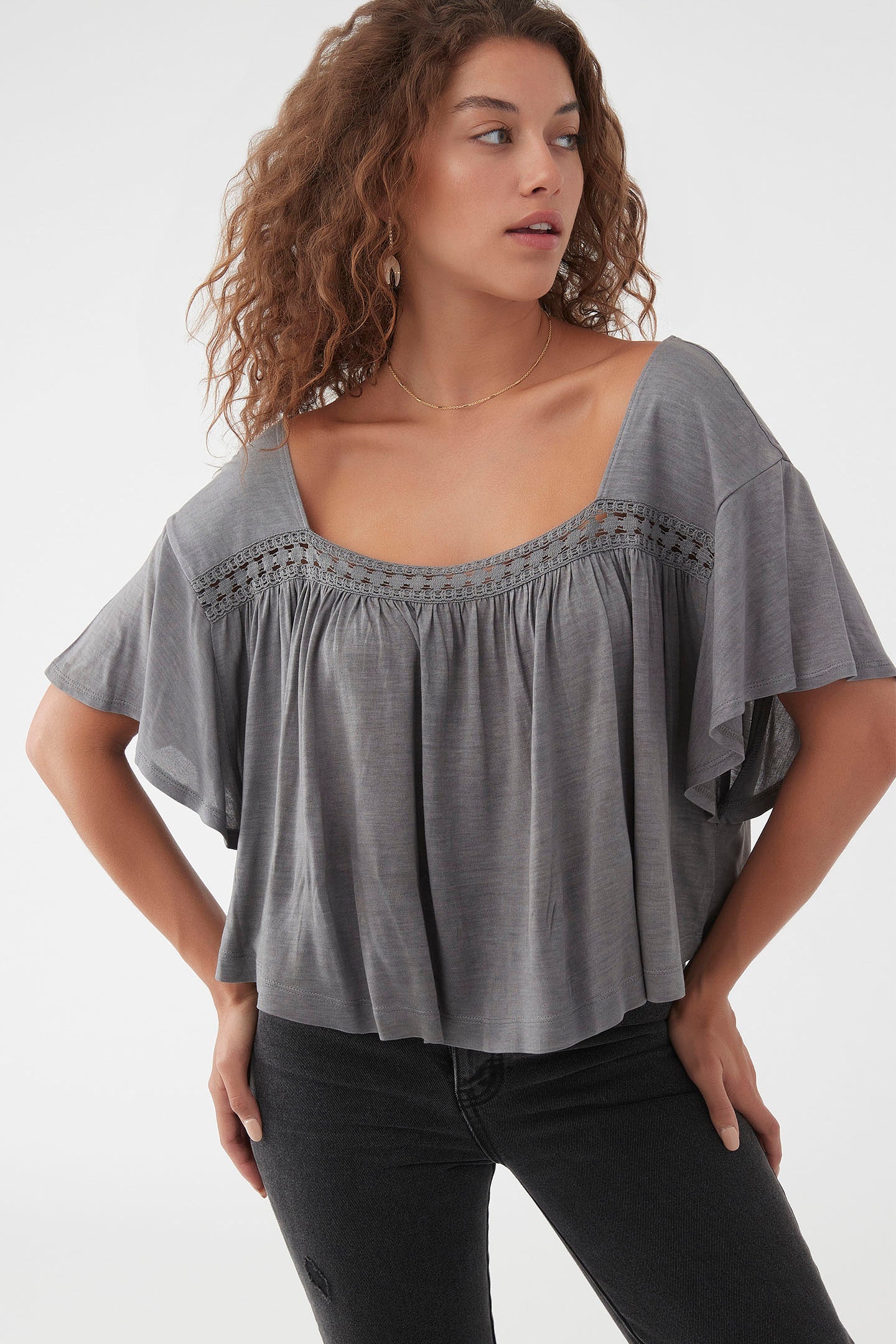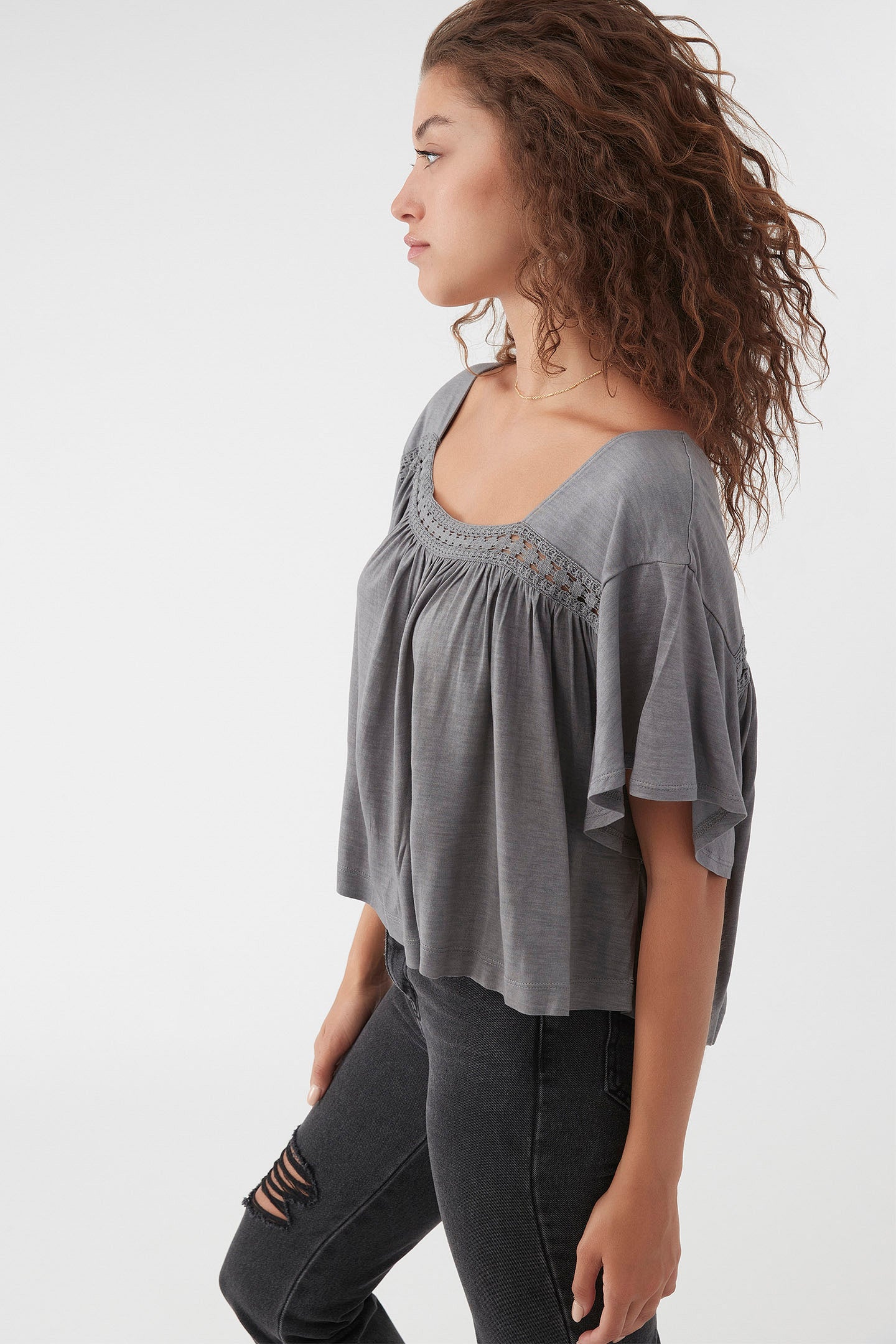 Soft and flowy lightweight top that has a crochet detail and solid color wash.