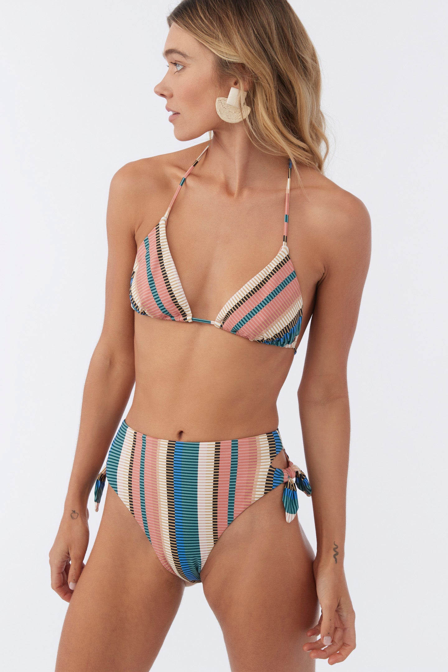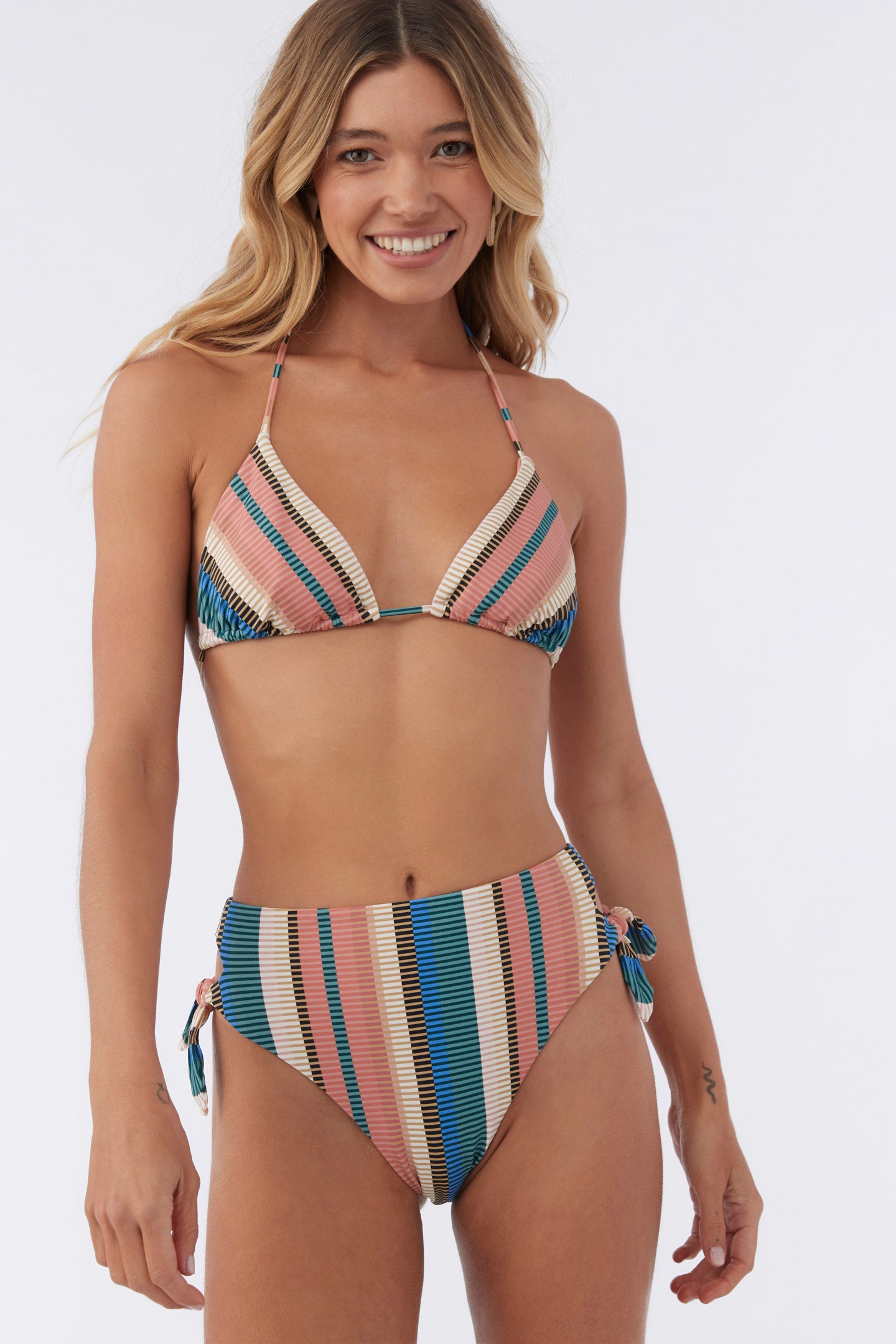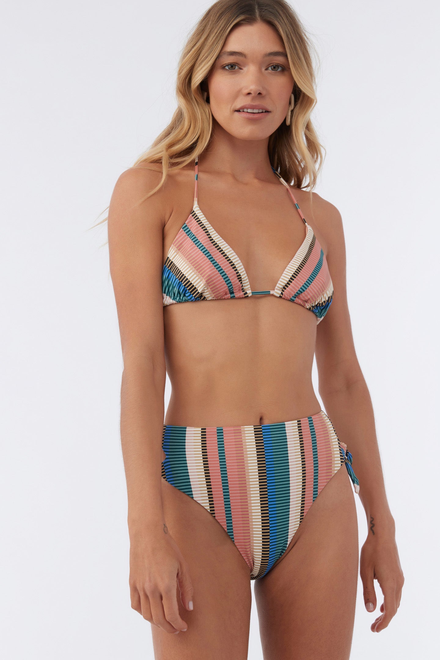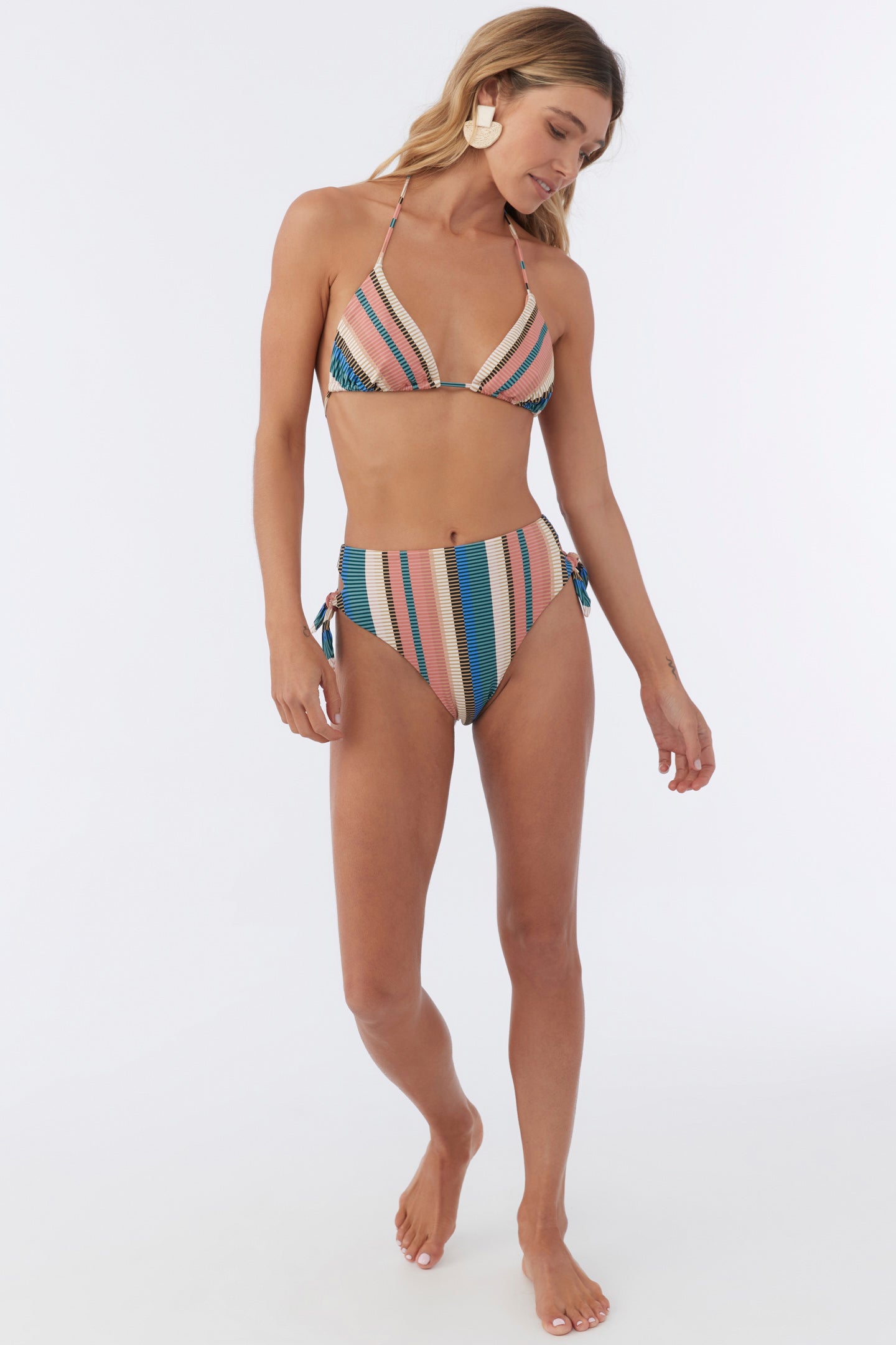 Get some sun or take a swim in this colorful bikini bottom. It has a high rise fit and strappy side tie detail.