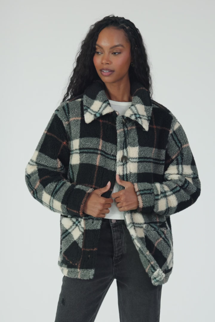 Get ready to turn heads and stay toasty in our ultra-cute high pile jacket, the perfect blend of cozy comfort and effortless style. This 28" beauty features a playful plaid print, handy patch pockets, and both button and zip closures, making it your go-to layer for conquering the cold while looking great.