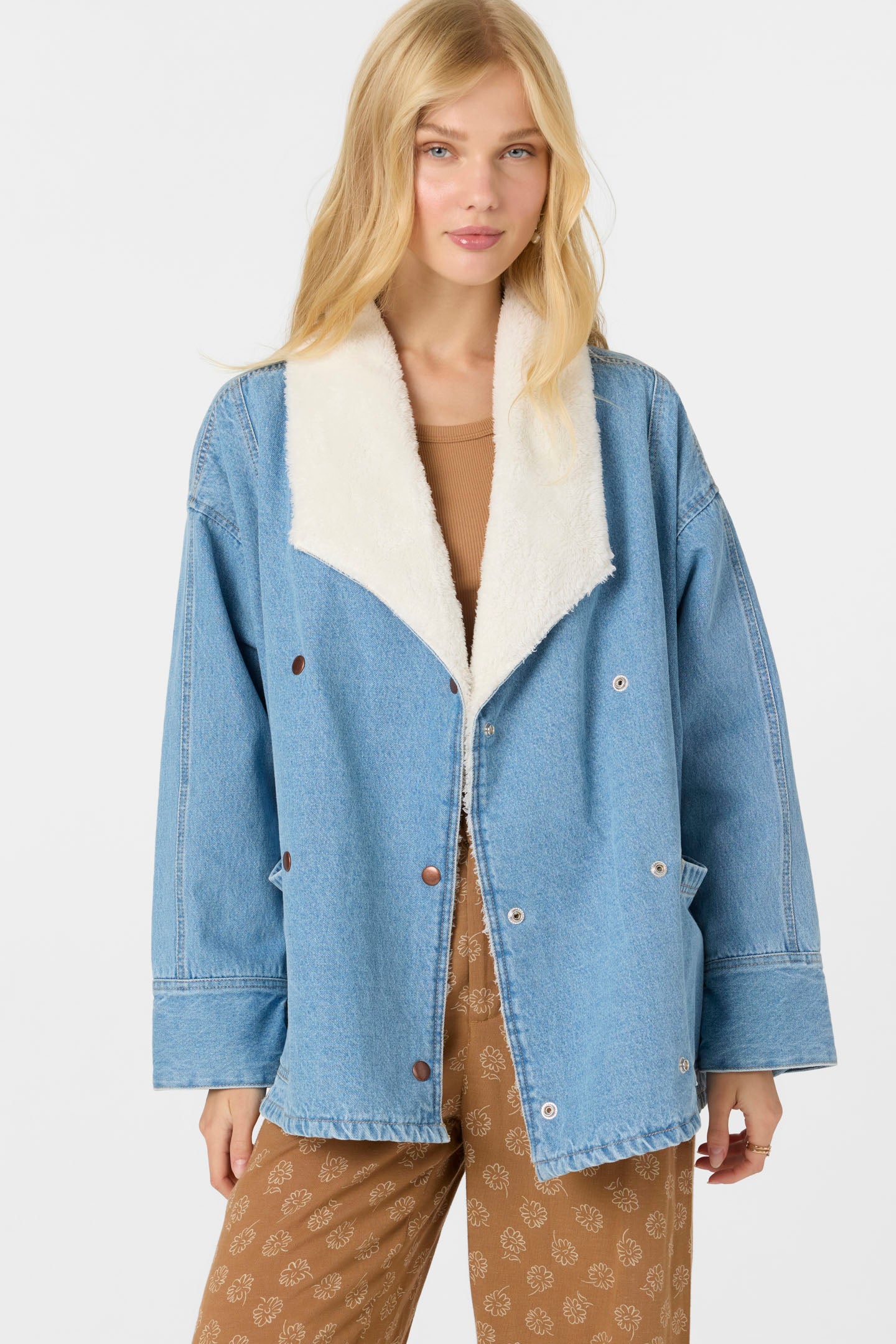 Essential for colder days, this denim jacket features a workwear-inspired silhouette, cozy high-pile collar and double-breasted front button closure. The standard fit is true to size, perfect for layering over your favorite top.