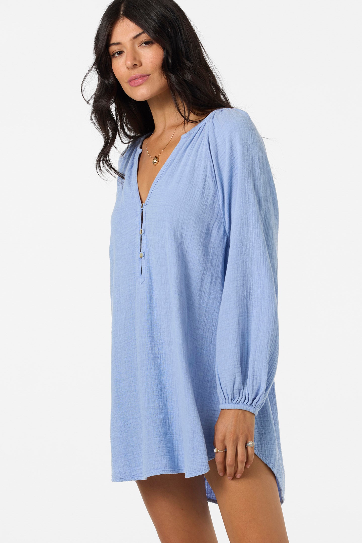 This flowy cover-up dress has a relaxed long sleeve design, mini length fit and deep v-neckline with button closure.