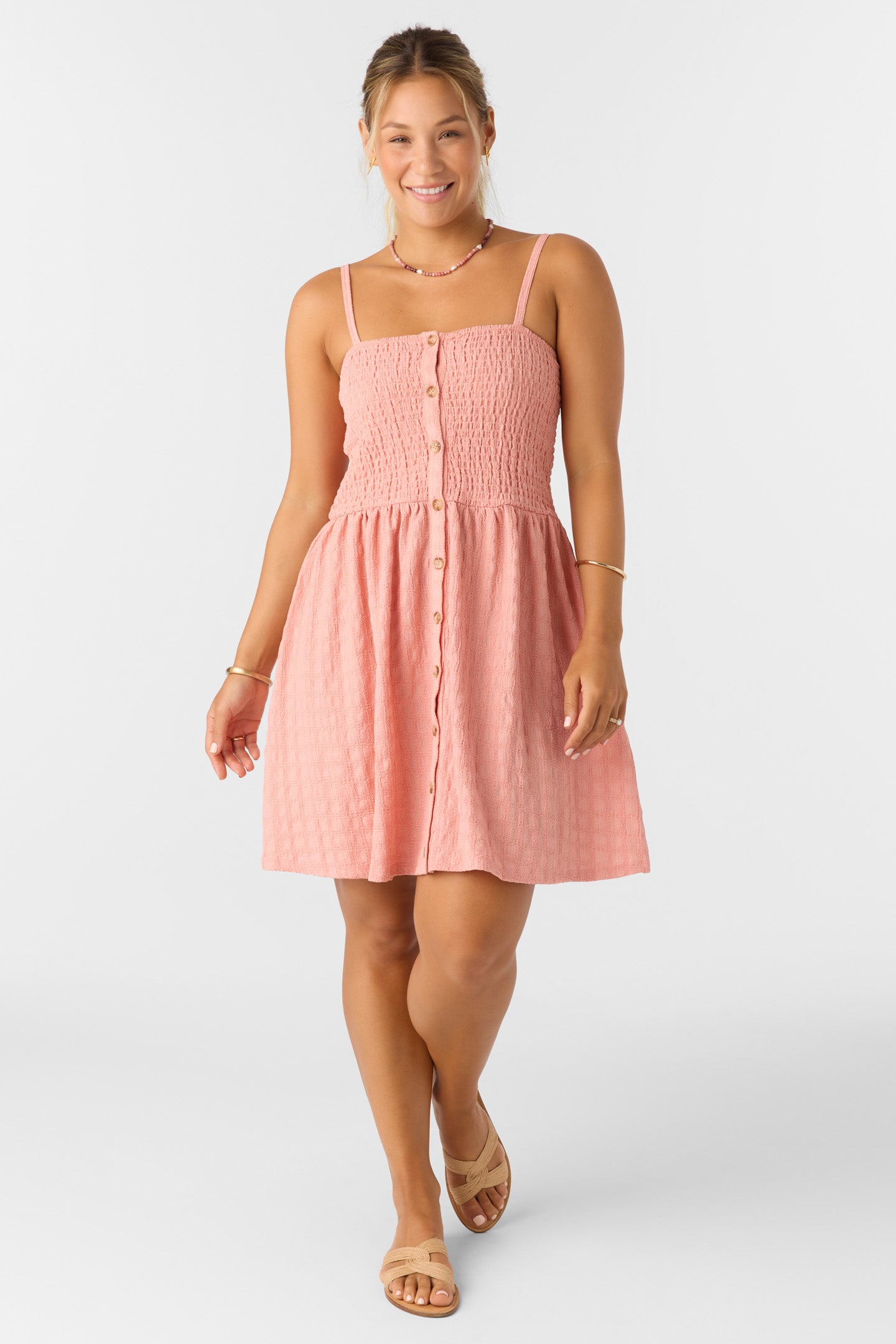 A knit mini dress that has a charming button-up look and a comfy smocked bodice that hugs you in all the right places. With adjustable straps and a breezy poly-blend fabric, you'll be ready for impromptu picnics or spontaneous road trips at a moment's notice.