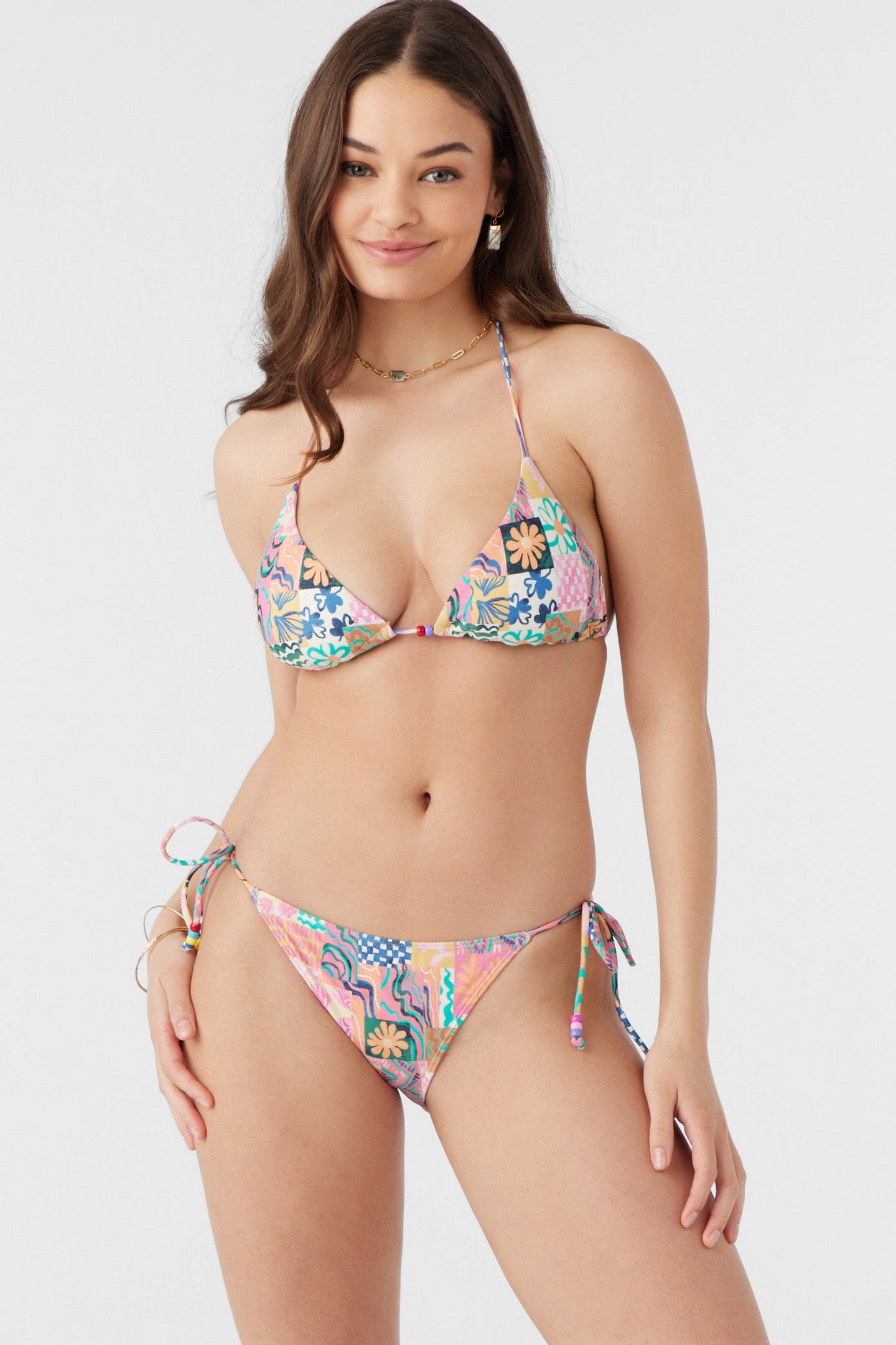 Just beachy. This is a classic triangle top that has a thin strap design and ties behind the neck and at the back.