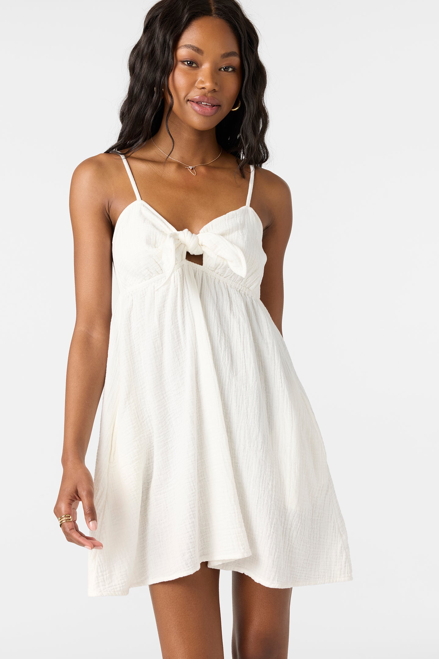 Effortlessly stylish woven mini that's made with a lightweight cotton double gauze fabric. It has a front tie detail with keyhole,solid color wash and adjustable shoulder straps.