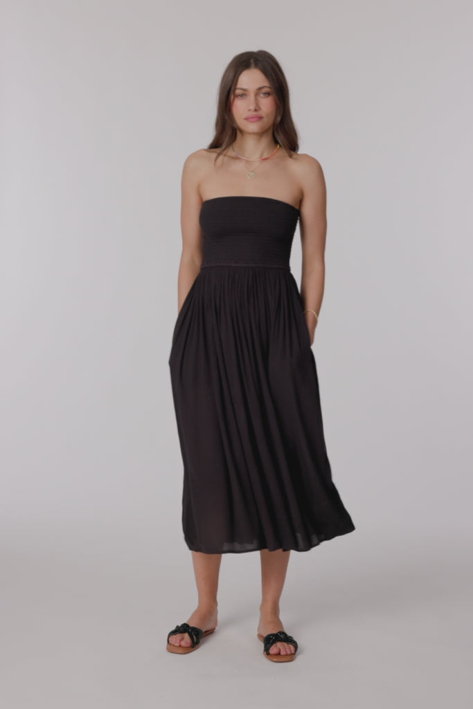 This woven midi dress features a smocked bodice, and flowy silhouette made for sunlit strolls.