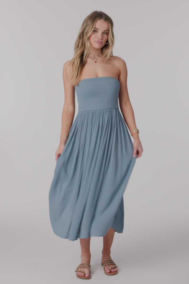 This woven midi dress features a smocked bodice, and flowy silhouette made for sunlit strolls.