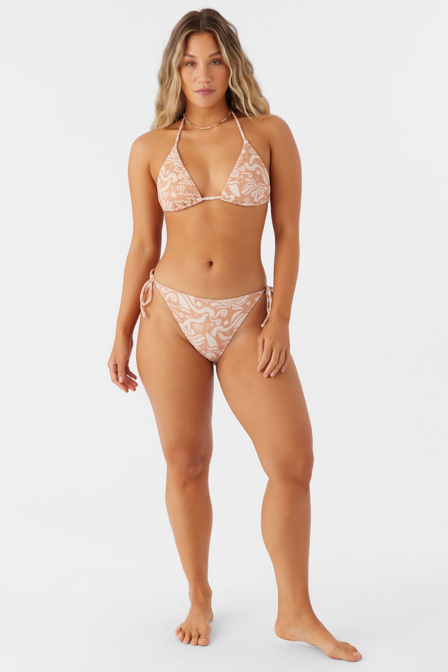 Just beachy. This is a classic triangle top that has a thin strap design and ties behind the neck and at the back.