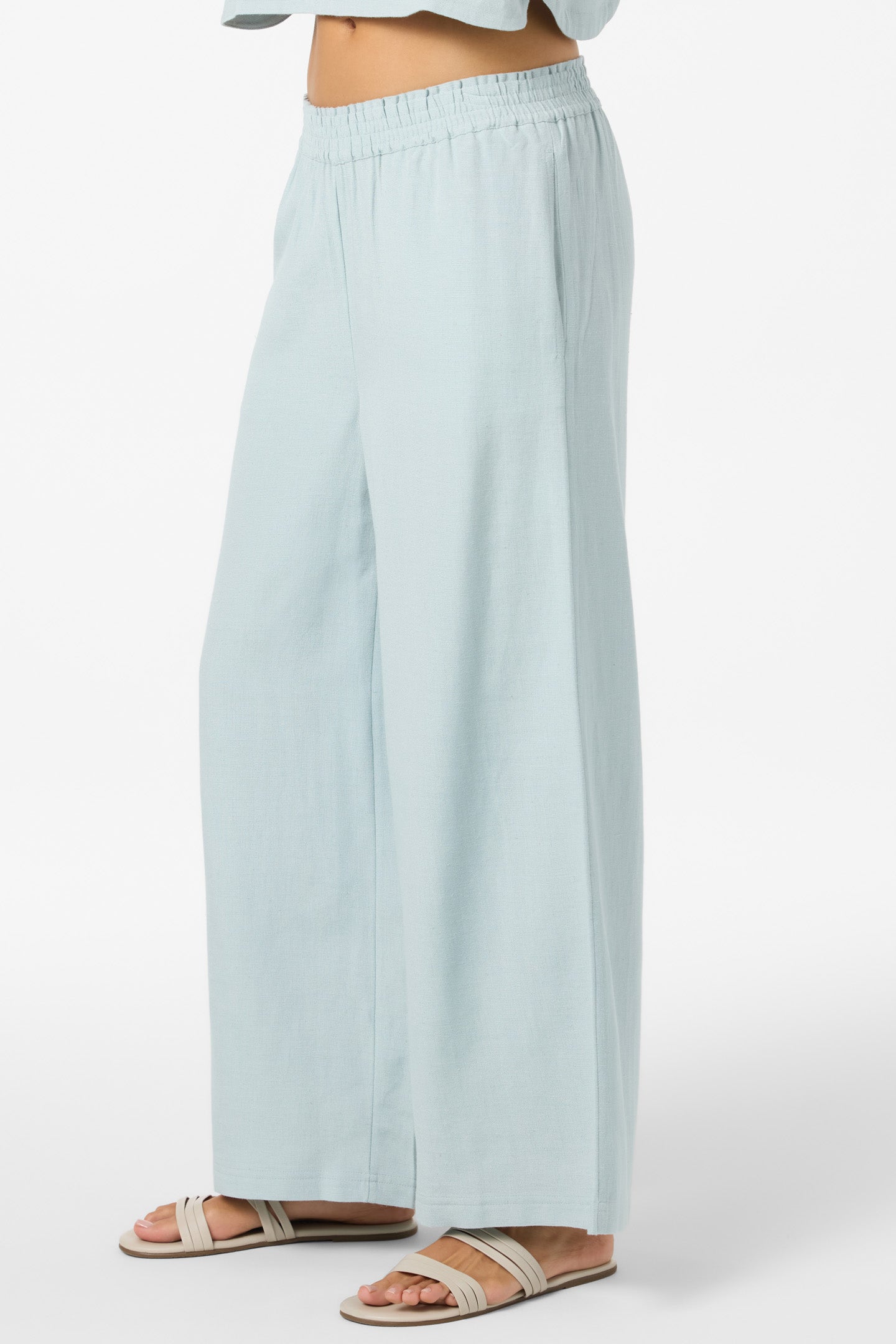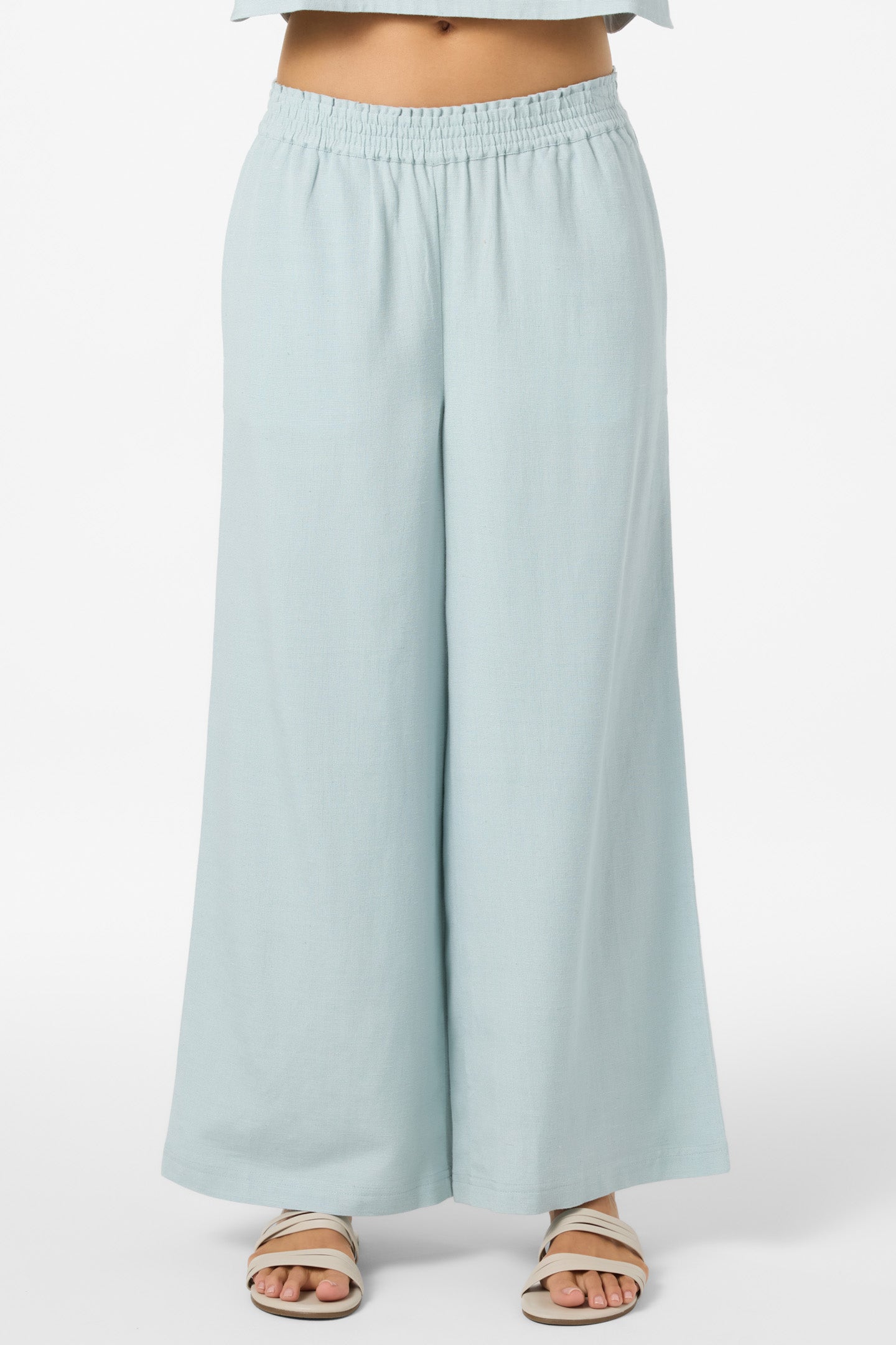Essential woven pant that has a relaxed, flowy leg fit, solid color wash and flood length fit.