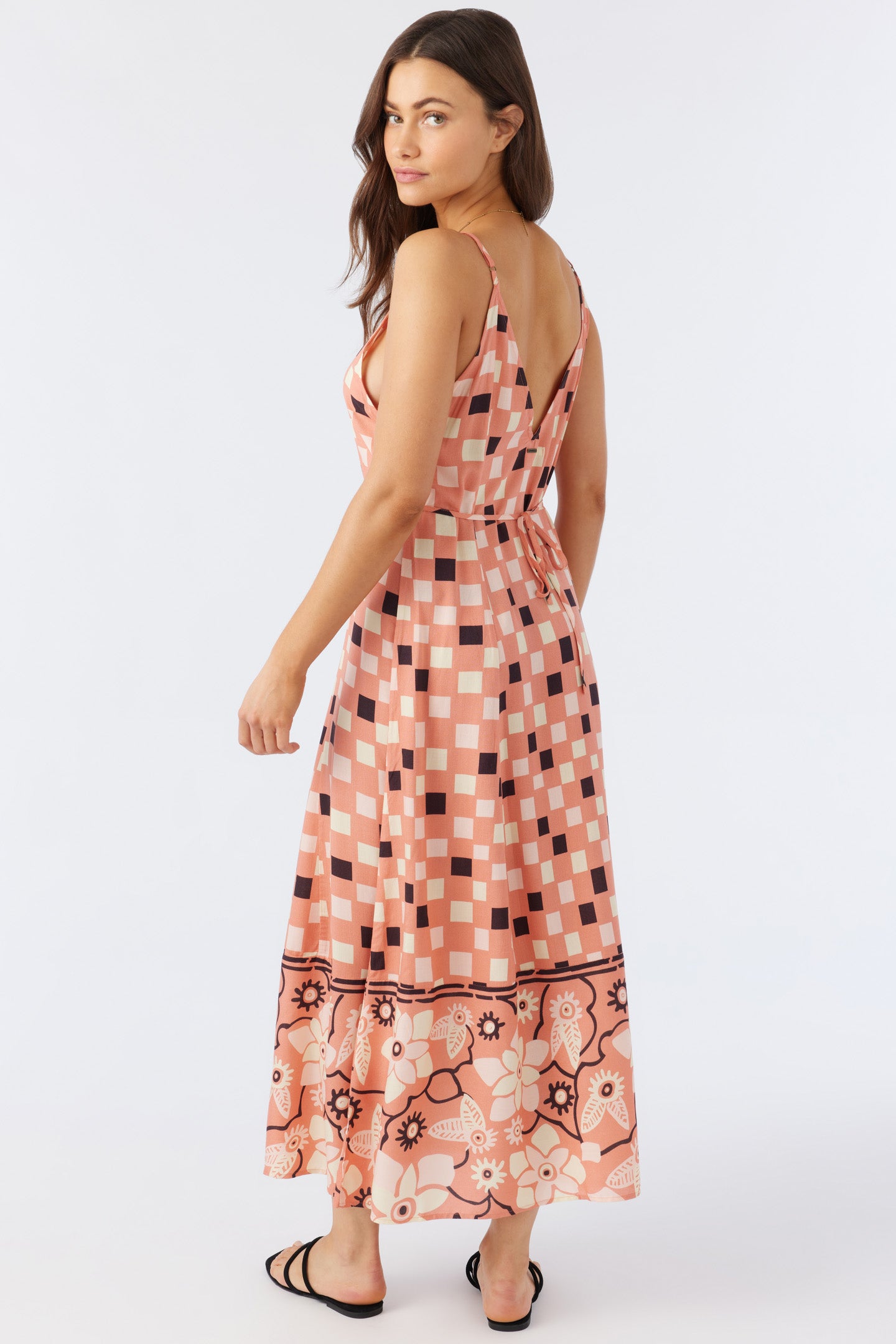You'll love the low-back design and colorful print of our Dorthie dress. It has a maxi length fit and ties at the back waist.