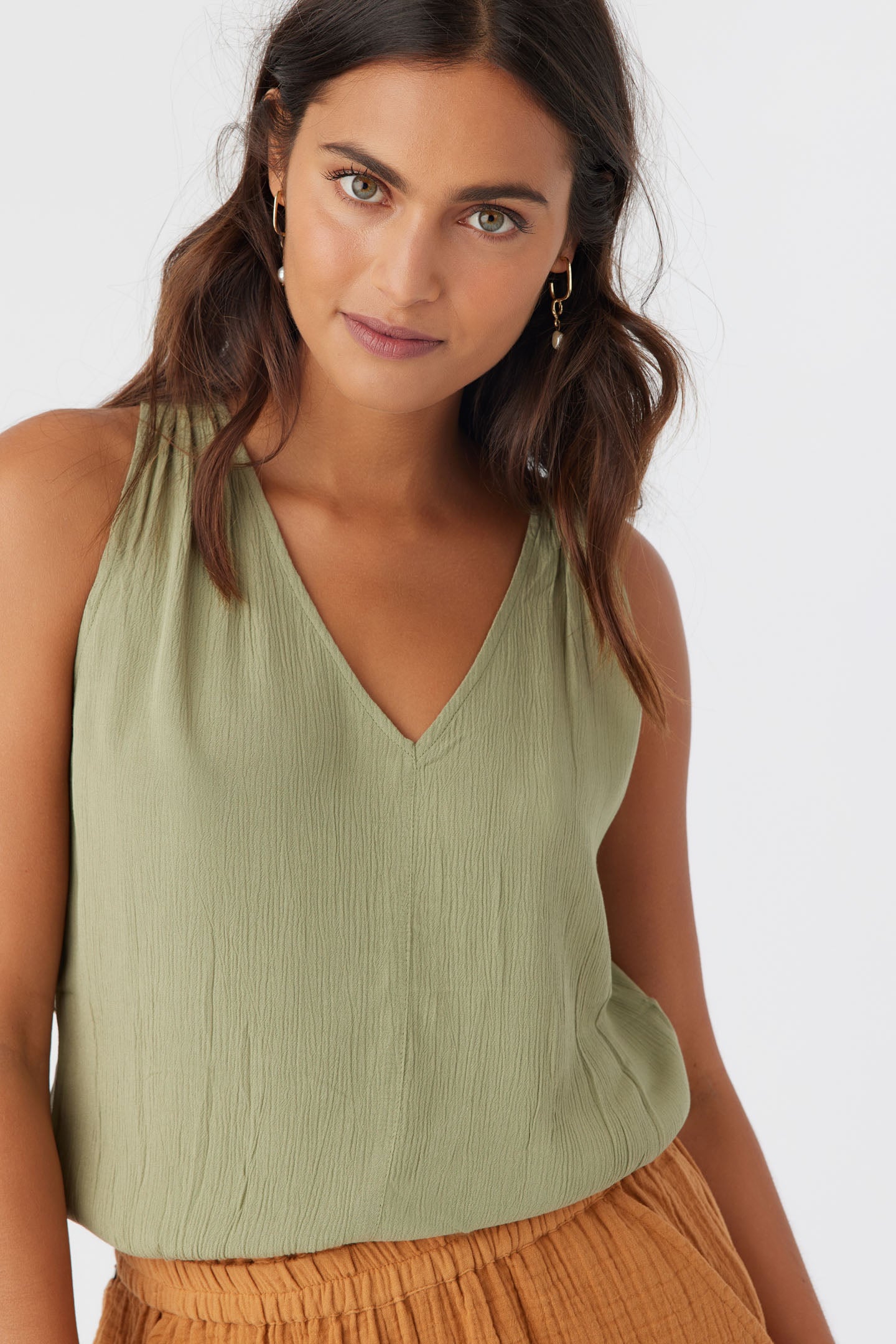 An easy-to-wear woven tank that's perfect for warmer days. It has a v-neckline and pleat detail at the back.