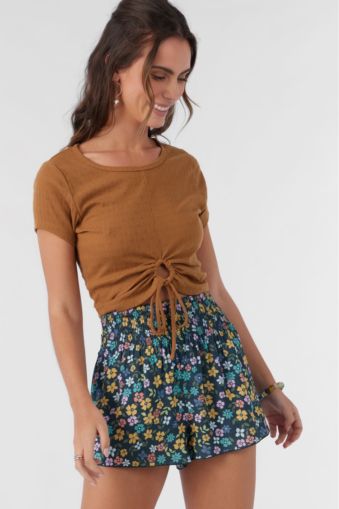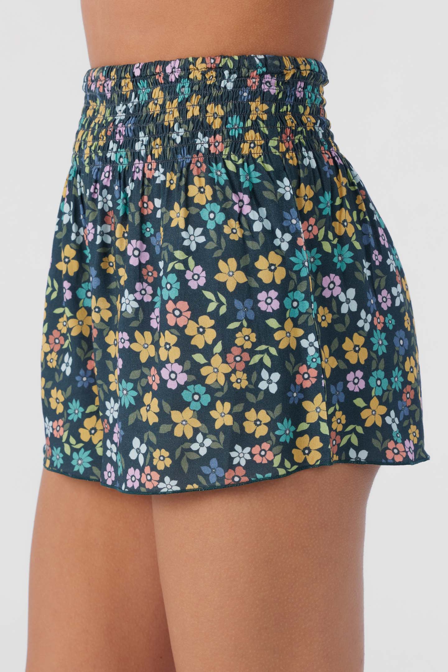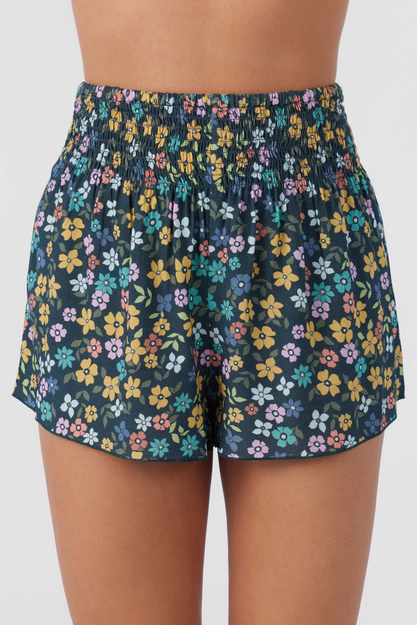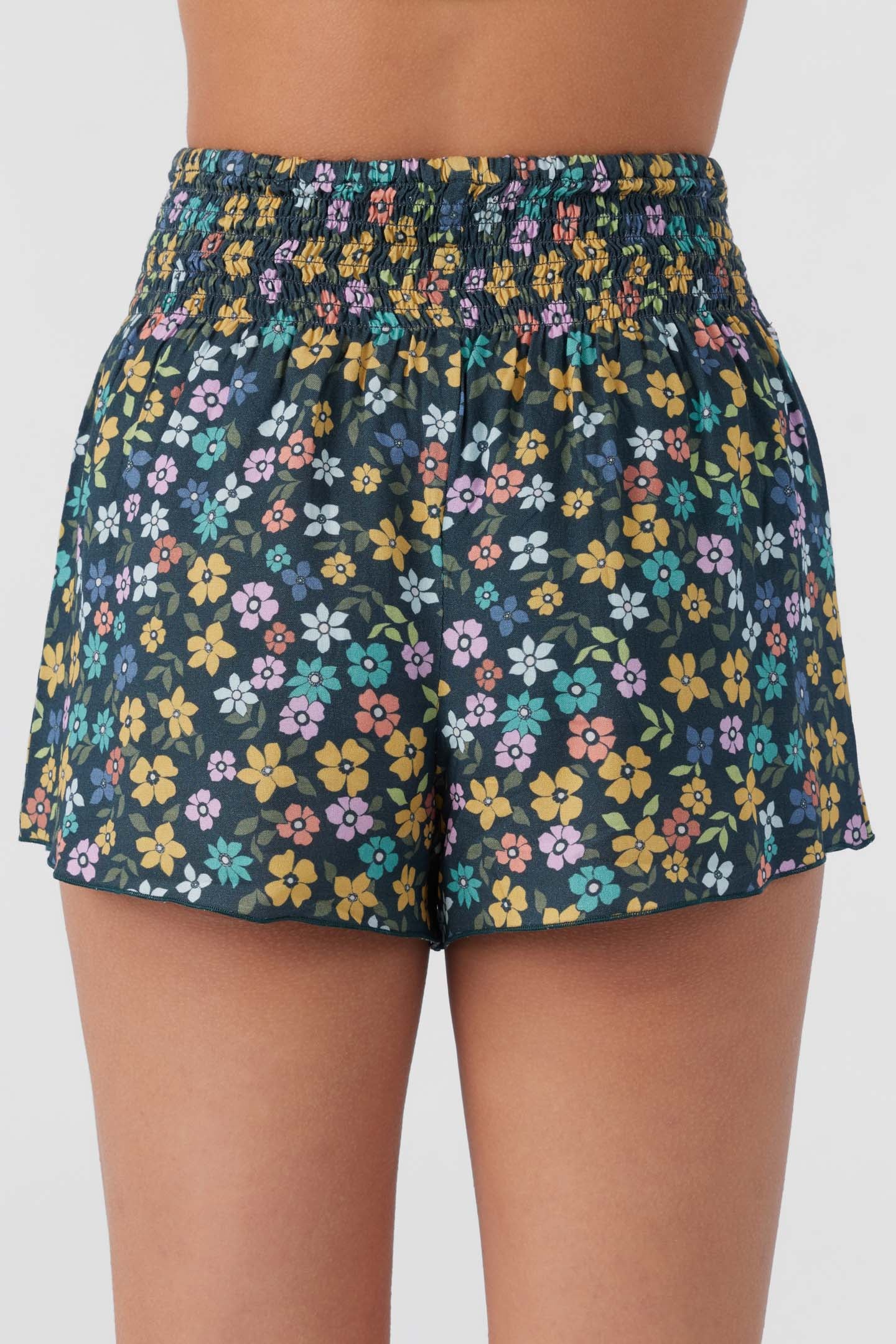 Cute and essential pull-on short that has an allover print design, smocked elastic waist and flowy fit.