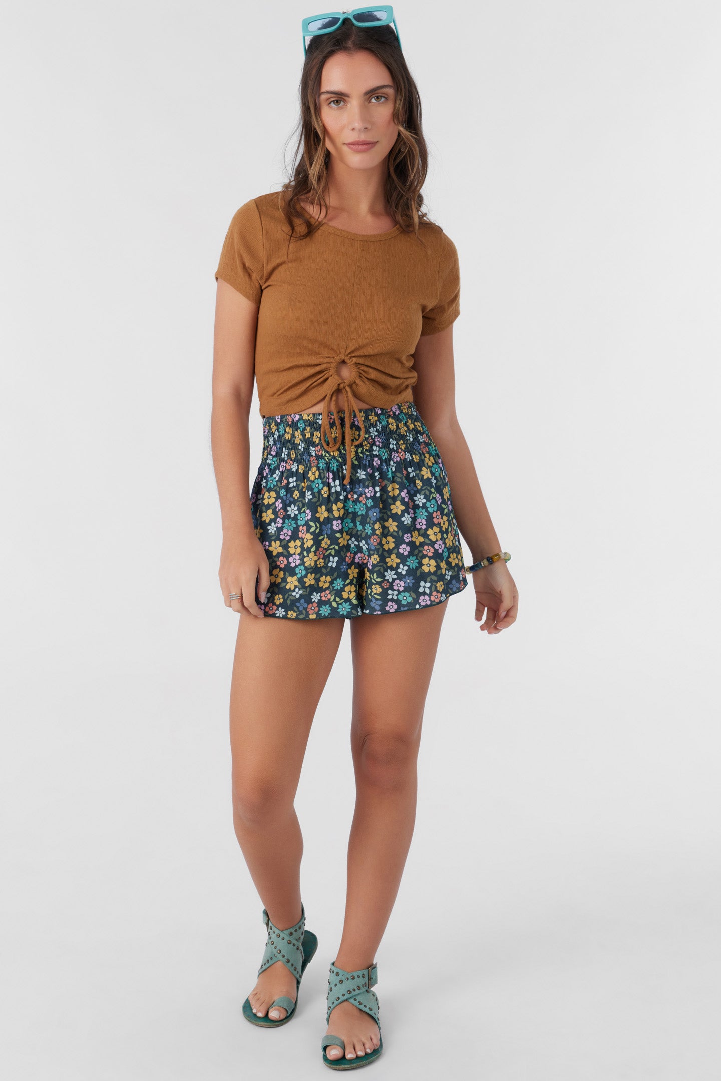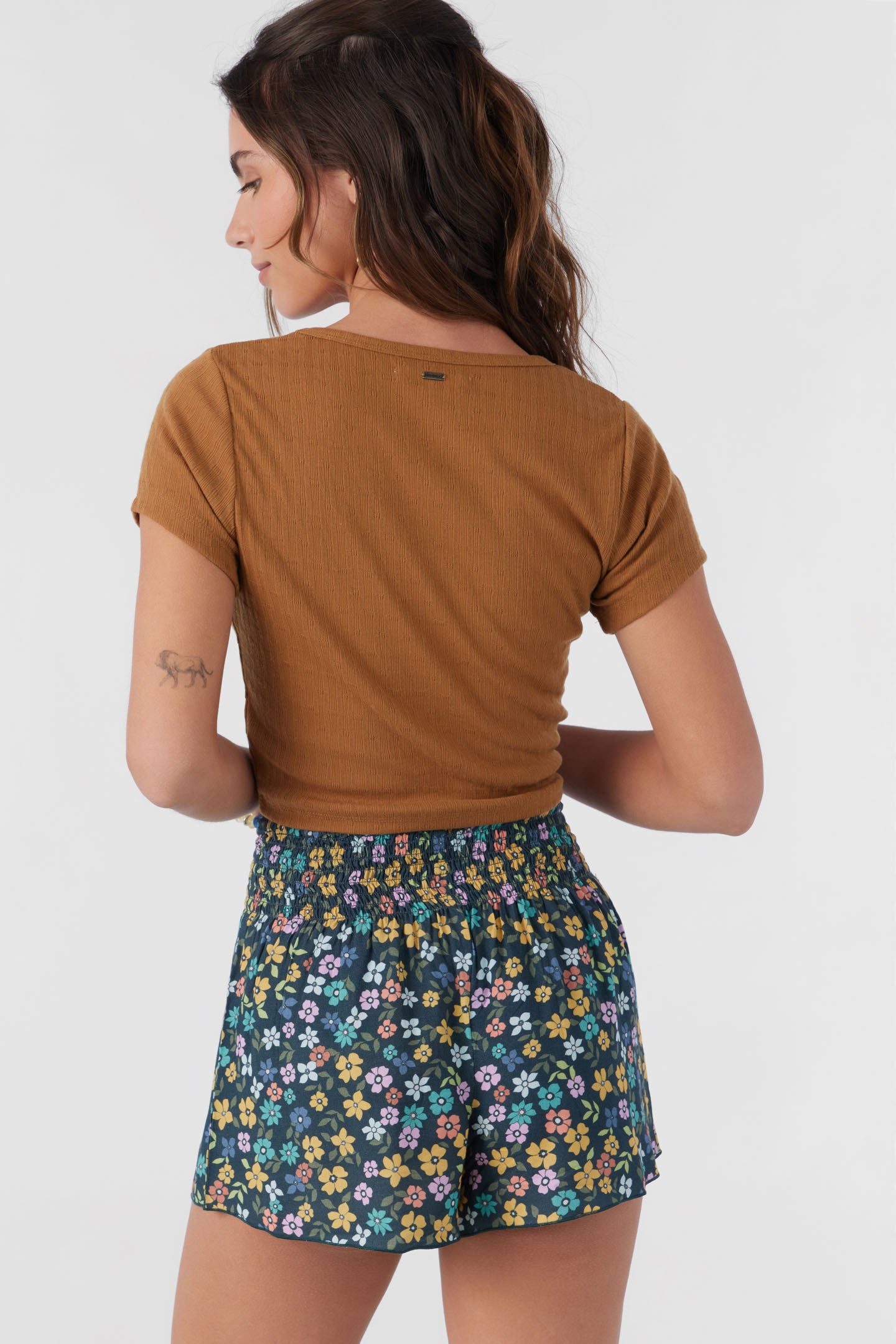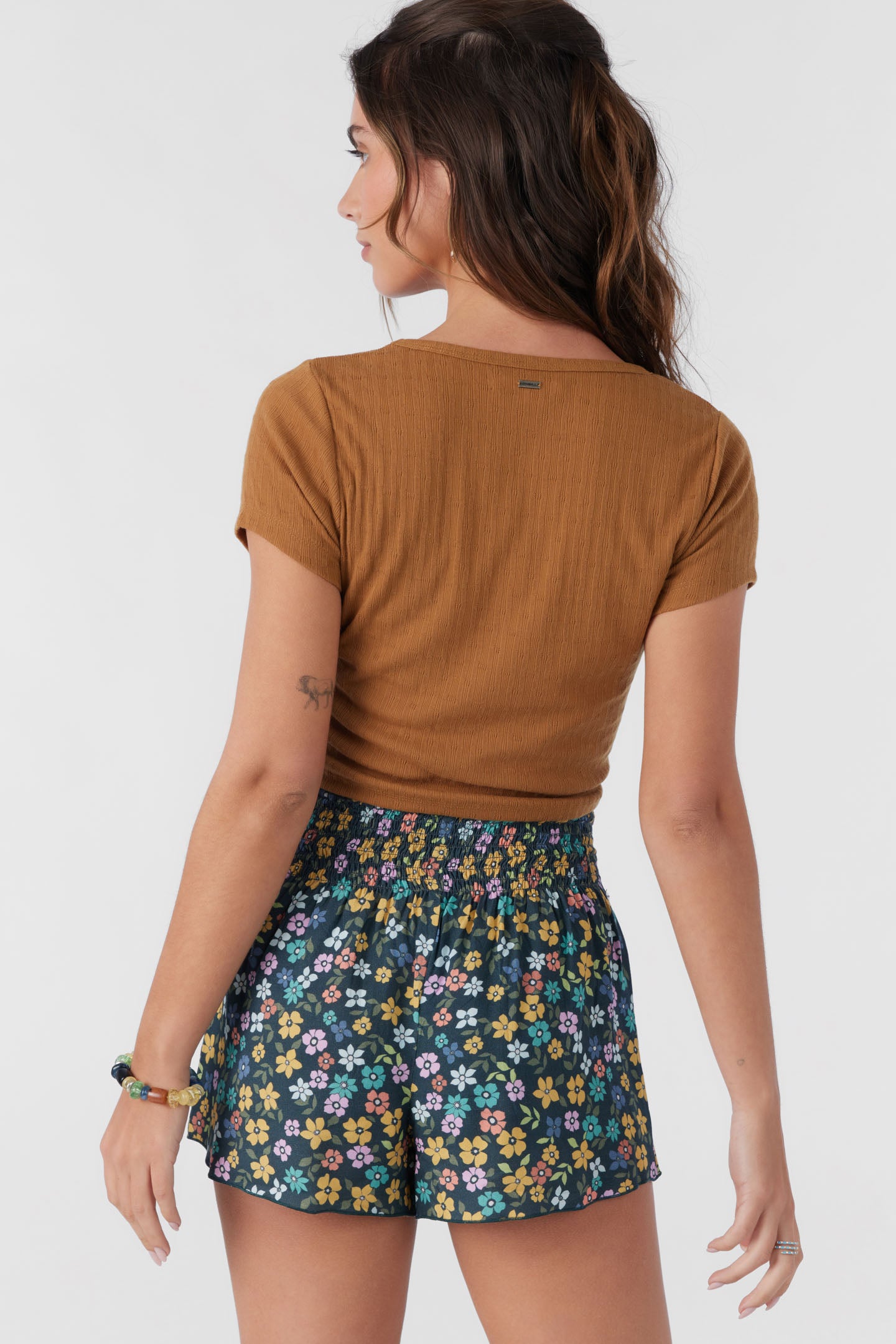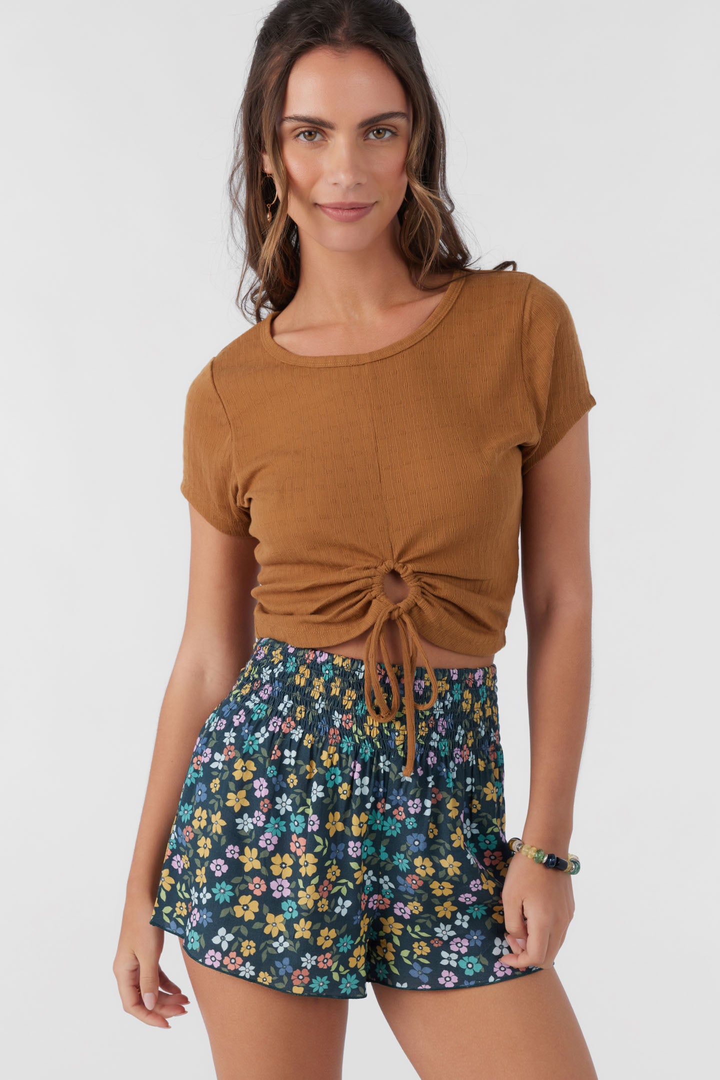 Cute and essential pull-on short that has an allover print design, smocked elastic waist and flowy fit.