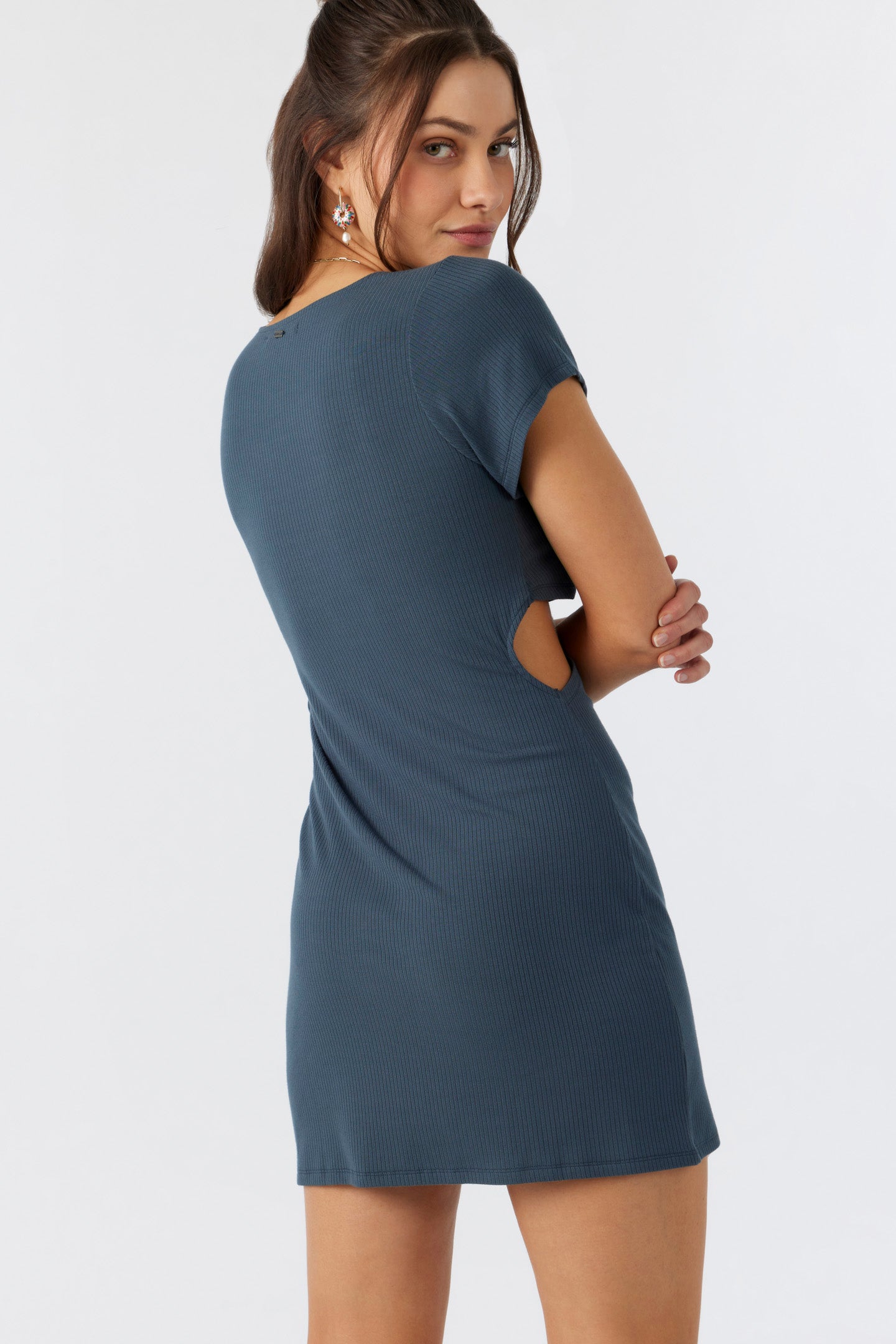Effortlessly styled knit mini that has a front ring cutout design, v-neckline and solid color wash.