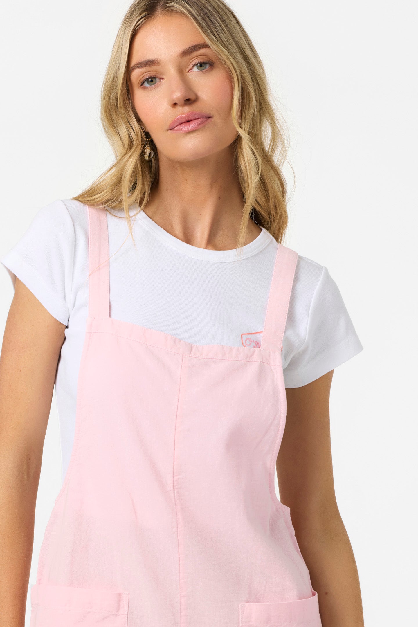 Easy and stylish overall romper that has a light cotton blend design, front patch pockets and adjustable straps.