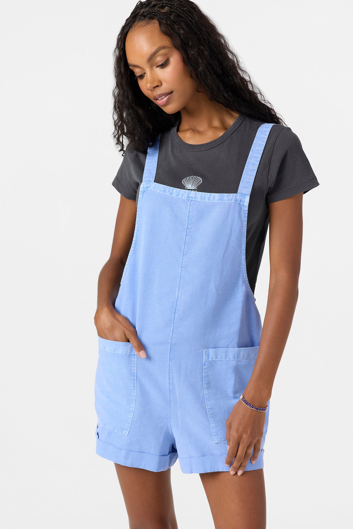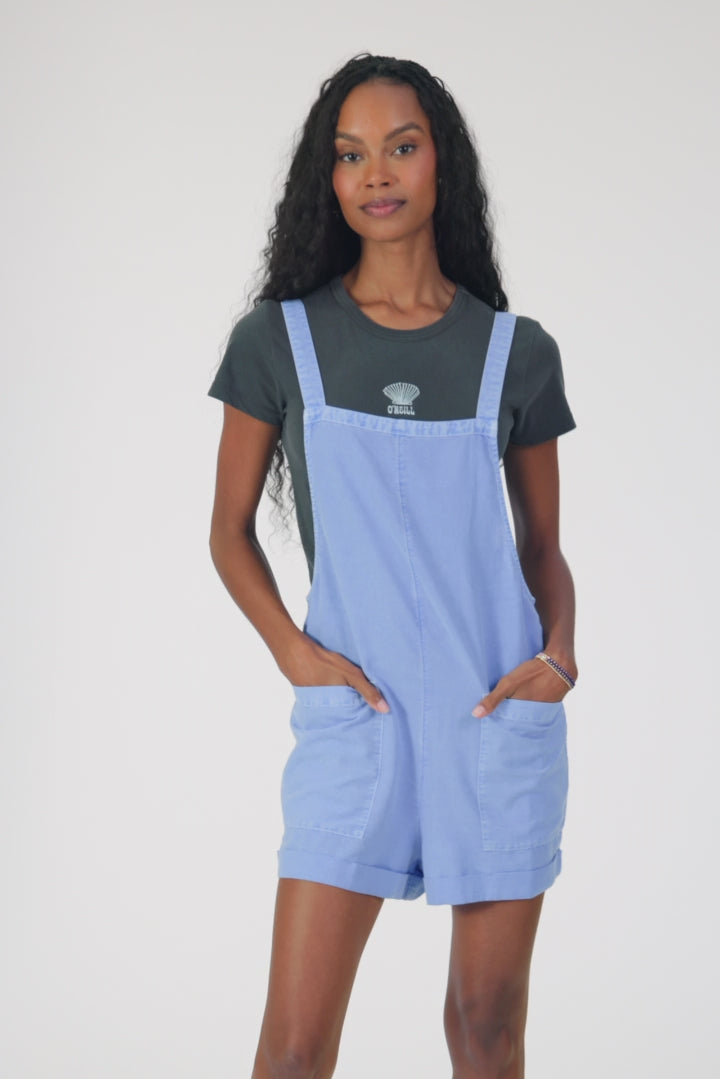 Easy and stylish overall romper that has a light cotton blend design, front patch pockets and adjustable straps.