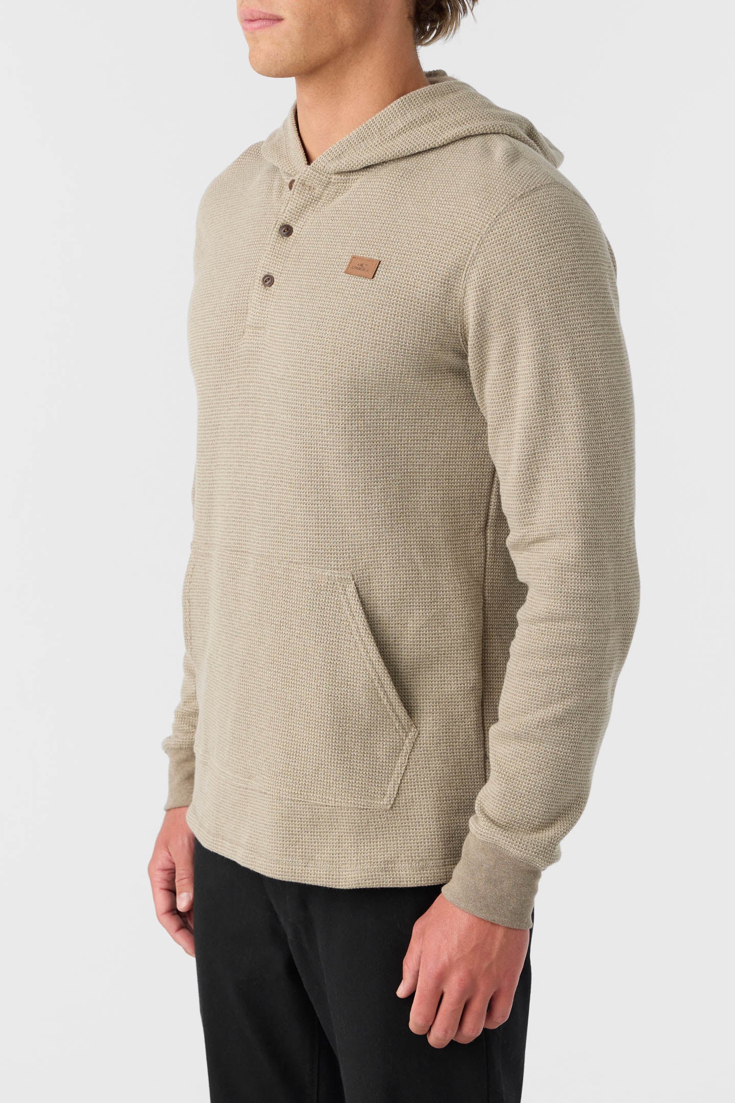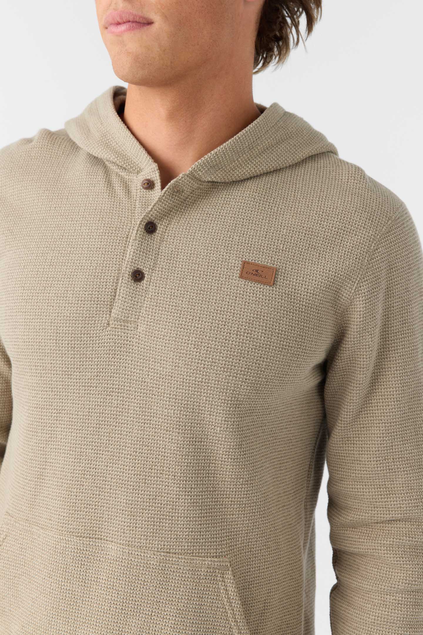 Dependable thermal hoodie that features a three-button closure, front kanga pocket and fits relaxed in the body and sleeves.