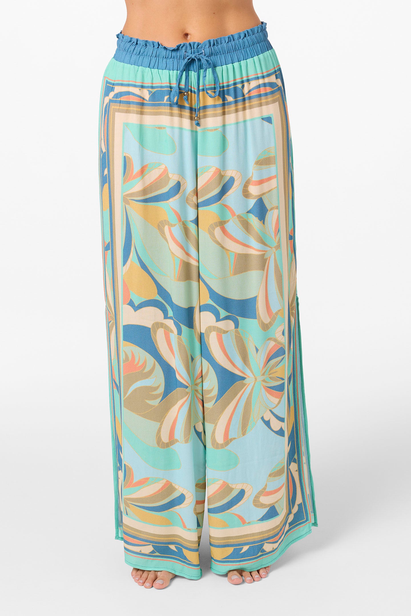 Laid back, flowy pants with wide legs, a tie front and colorful print.