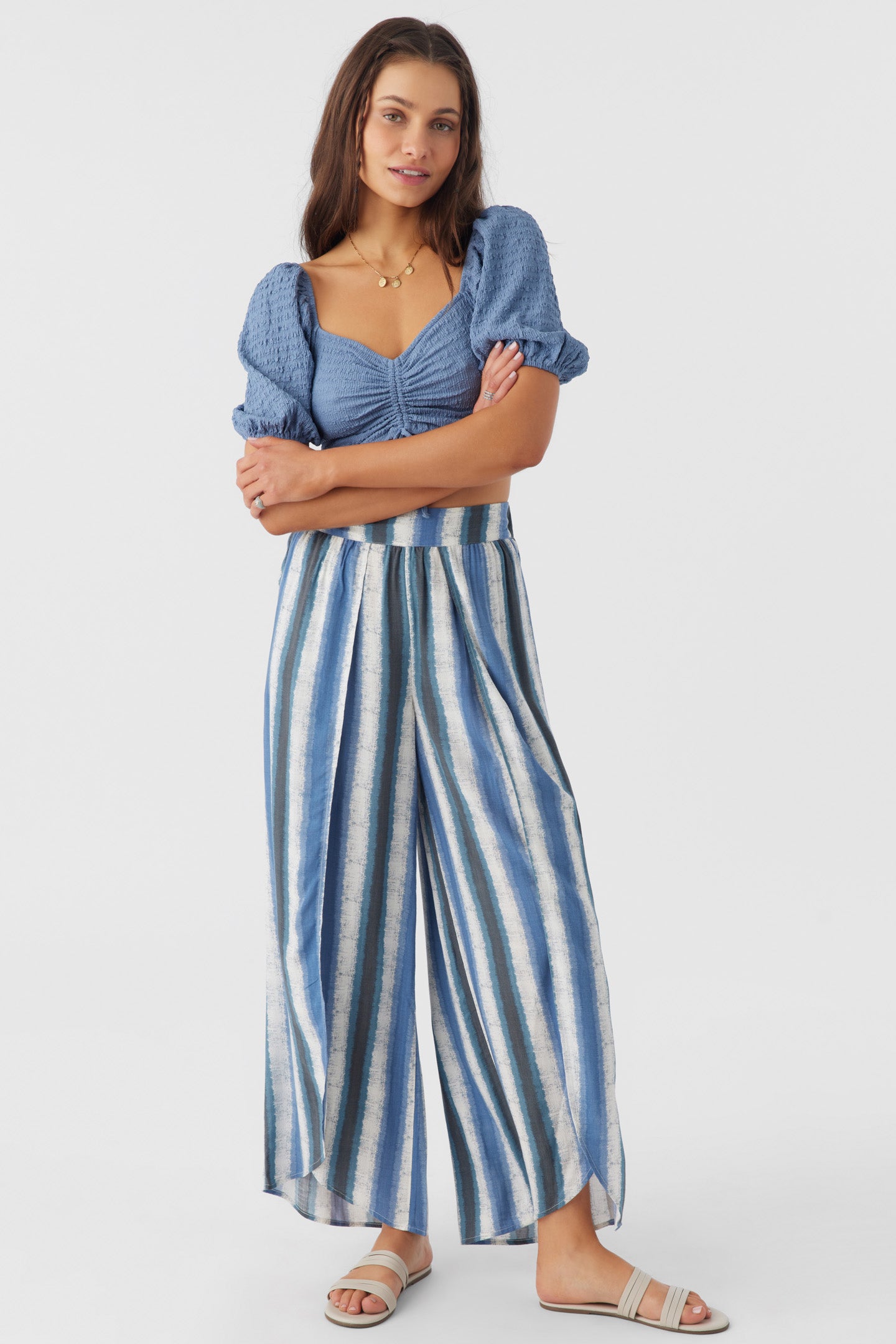 Laid-back, flowy woven pant that radiates effortless style. It features an elastic waist, wider fit and split leg detail.